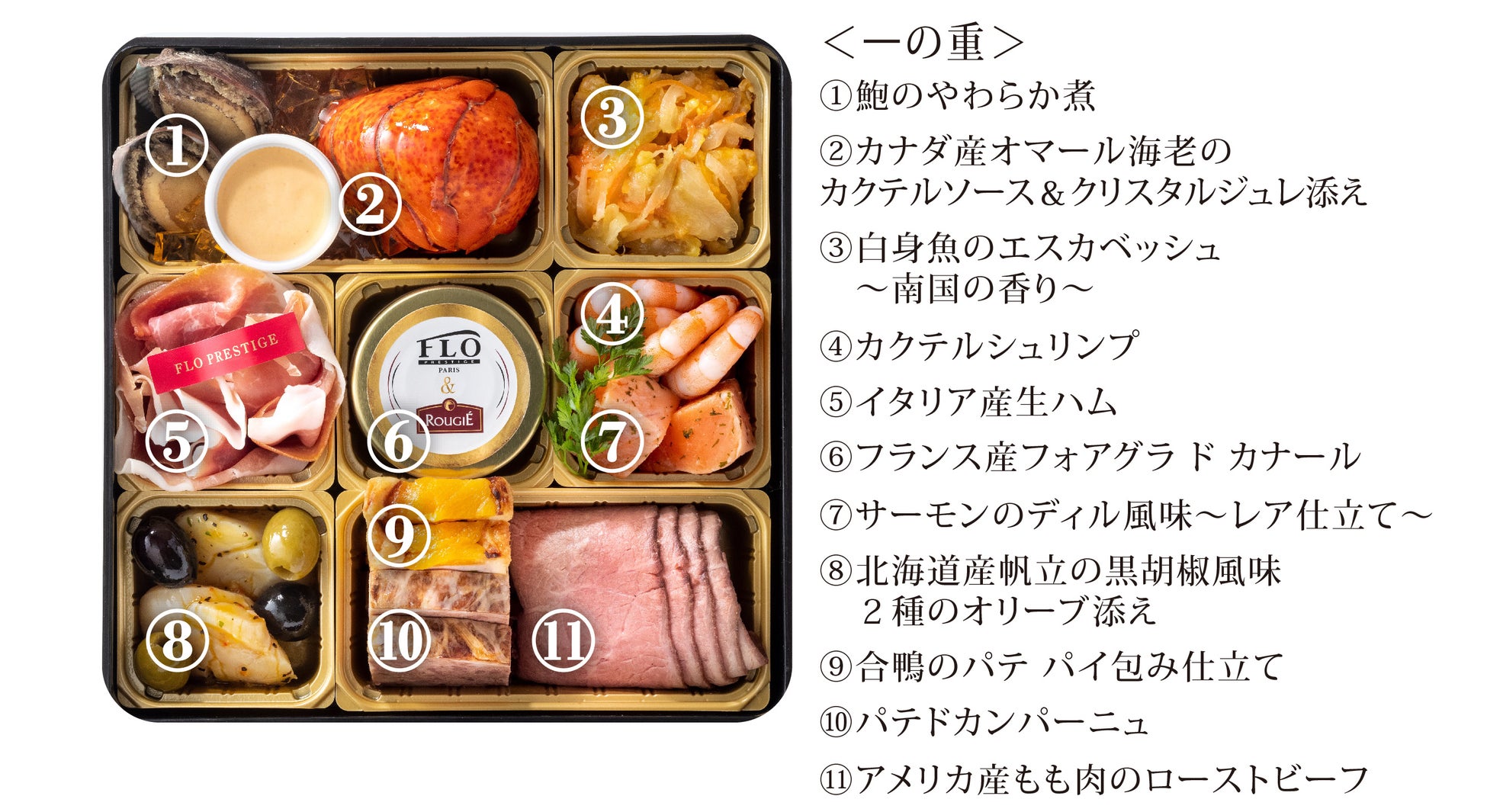 関東を中心に洋菓子・洋惣菜のテイクアウトショップ116店舗(2022年9月現在)を展開する株式会社フロジャポン(本社:東京都武蔵野市)が運営するフロプレステージュでは、「Smile with French」のブランドコンセプトのもとに、フレンチレストランのような豪華食材をふんだんに盛り込んだ、オリジナリティのある“フレンチおせち”を、数量限定・予約限定で販売いたします。