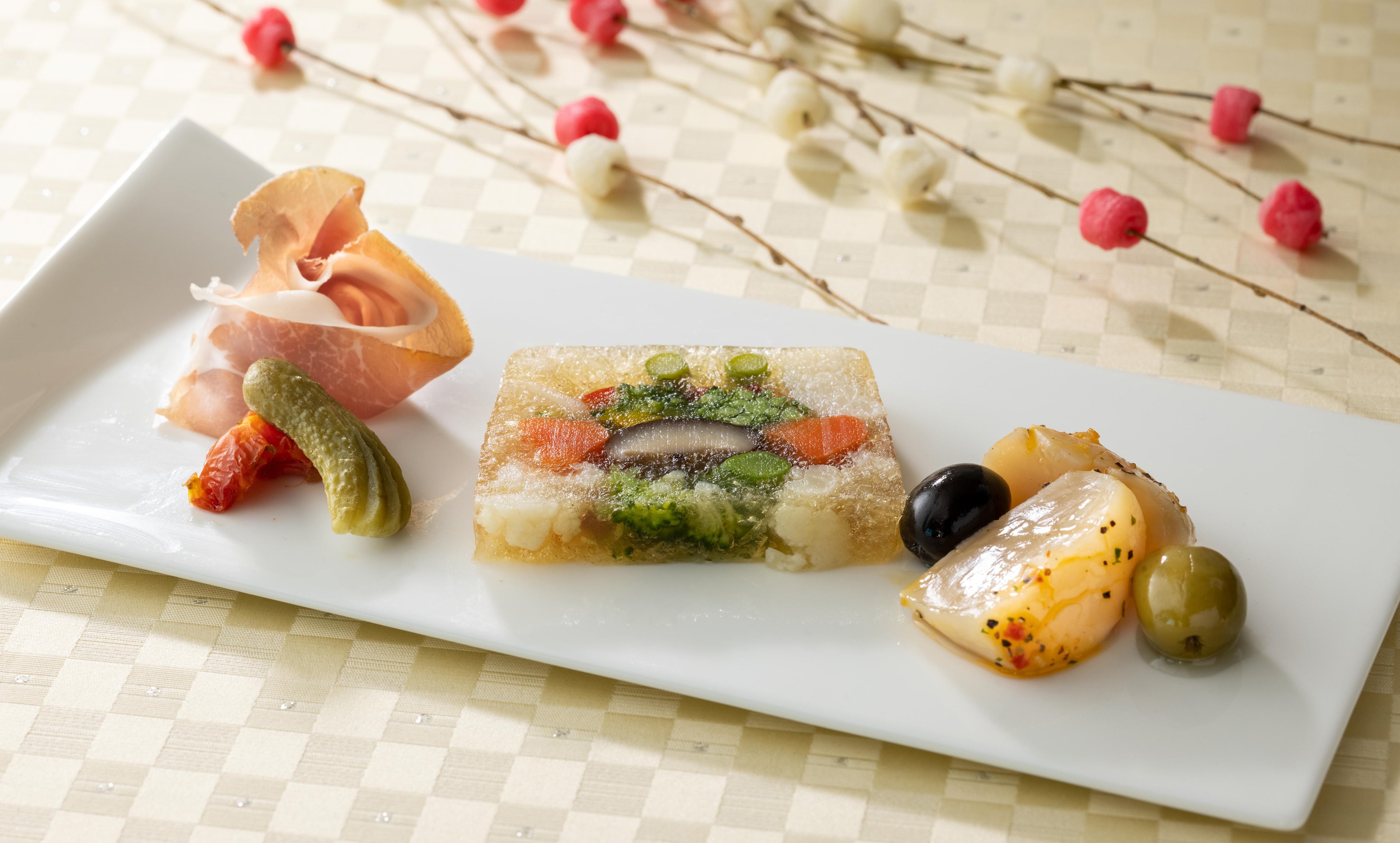 季節の野菜をコンソメゼリーでテリーヌにしました。