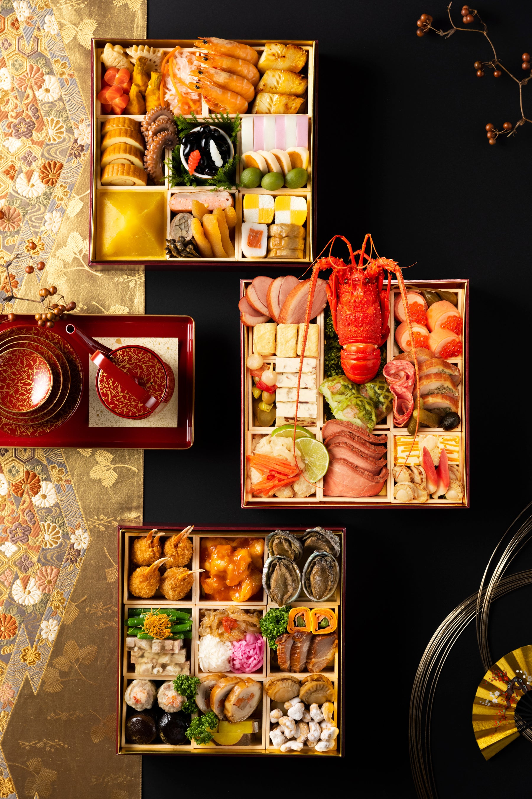 素材選びからこだわり手間を惜しまず巧みな技で丁寧に仕上げた料理。日本伝統の和食おせちには祝い肴、口取り、寿の物、多喜合せを一段に詰め合わせしました。洋食おせちは、長寿の願いを込めて高級食材でもある国産伊勢海老を使用した豪華メニューなど西洋の代表的な料理をご用意。中華おせちは、幸運を招く蟹爪や不老長寿の象徴の鮑など医食同源の国のお祝い料理を揃えました。