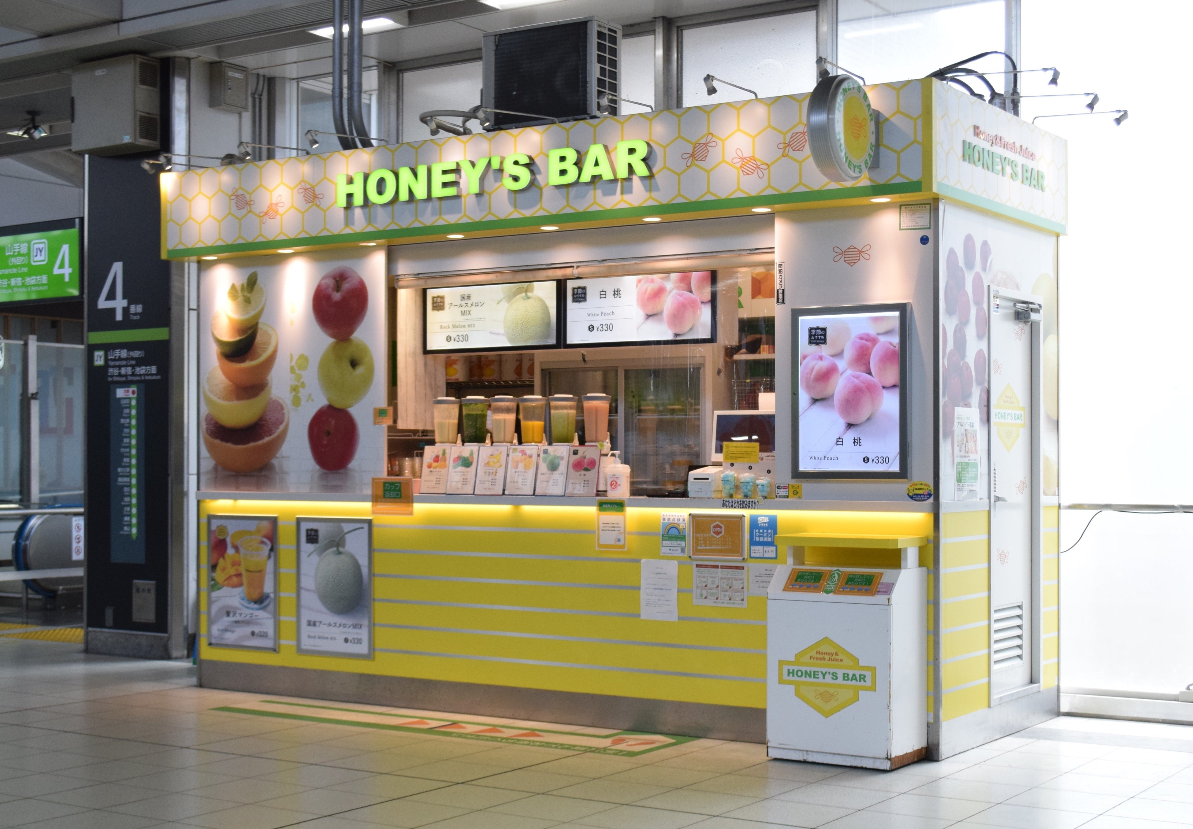 スタンド。「駅のエネルギーチャージスポット」をキーワードに、新鮮な季節の果物やミルク・ヨーグルトにはちみつを合わせたフレッシュジュースを常時5~8種類そろえています。現在は19店舗を運営中。