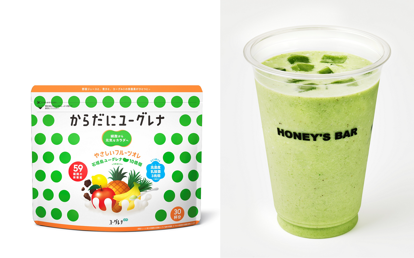 ユーグレナ社とJR東日本クロスステーション社は、外出時に美味しく手軽にミネラルやビタミンなどの栄養を補給できるオリジナルコラボドリンクとして、59種類の豊富な栄養素を含む石垣島ユーグレナに、4種のフルーツと黒糖の甘味を加え、小さなお子様から大人までご好評いただいている「からだにユーグレナ やさしいフルーツオレパウダー」を使用した新ドリンクメニュー『石垣島ユーグレナ×キウイヨーグルト』を共同開発し、駅のジューススタンド「ハニーズバー」にて発売いたします。尚、ご購入いただいた方には、「からだにユーグレナ やさしいフルーツオレパウダー」のサンプルをプレゼントいたします。