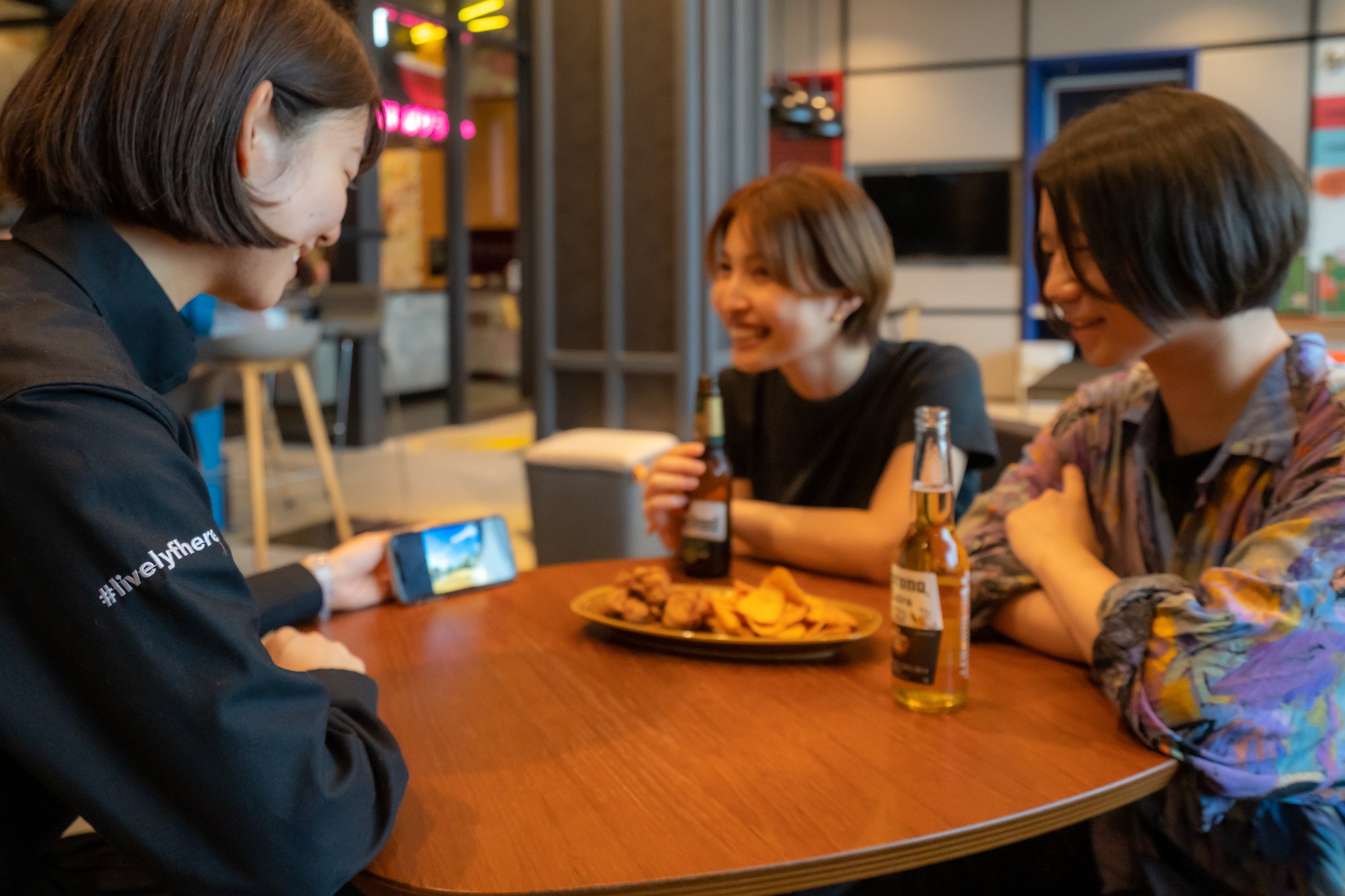旅好きの仲間と次の旅行計画を立てたり、lyfガードと旅の思い出を共有したり。偶然居合わせたお隣さんと、旅とビールで繋がることができるコミュニティ体験もこのイベントの醍醐味。秋風を感じながら、開放感あふれるテラス席でまったり過ごす時間もおすすめです。唐揚げ棒やオクトパスボール等、ビールのお供にぴったりなおつまみもご用意しております。