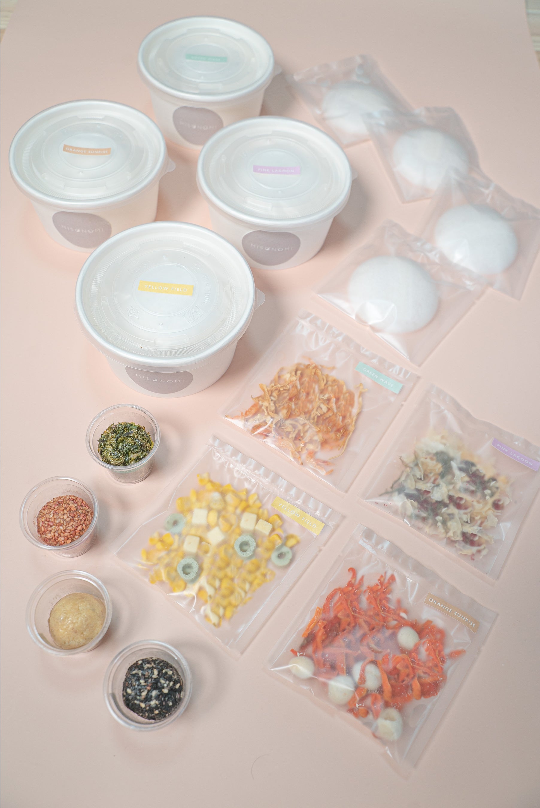 MISONOMIはキャンバスに見立てたもなかに彩り豊かなフリーズドライの具材と旨味たっぷりの生みそを盛り付けた、ちょっと新しいみそスープの実。ご自身の手でお湯を注ぎ、実を崩していくと、温かな一杯が出来上がります。 素材にこだわった甘みのある麦みそとあごだし、ヴィーガンでも楽しめる玄米みそと野菜ブイヨンなどヘルシーで旨みたっぷりの出汁とフリーズドライの具材を組み合わせました。カレースープやポタージュスープ、スパイシースープなど8種の個性豊かなスープそれぞれには、春夏秋冬の情景や、広大な景色と色彩をモチーフにしてアートのように作品名が付けられています。