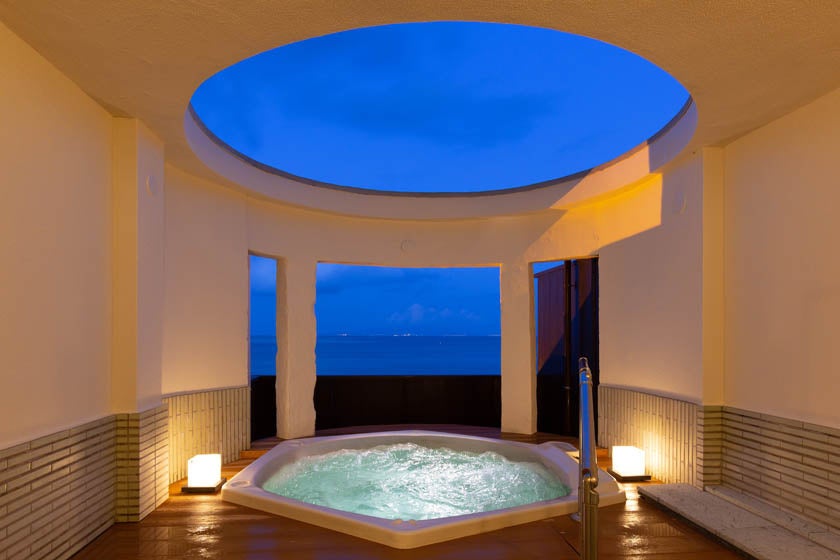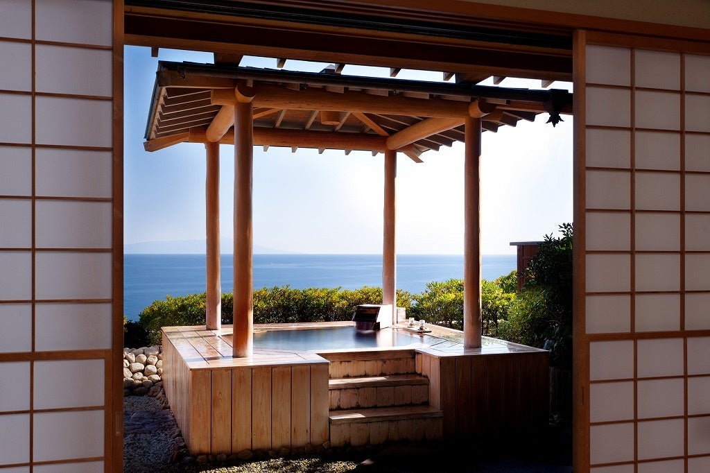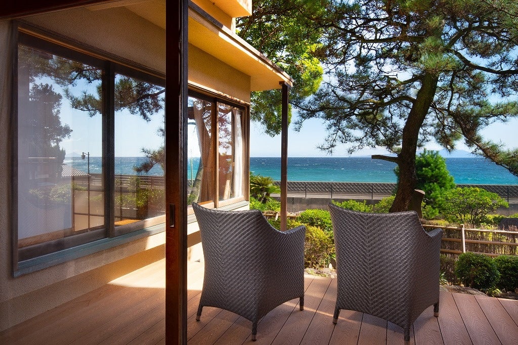 客室は、目の前に相模湾のパノラマが広がる、海と空の特等席「庭園露天風呂付き客室」、最上階から海と空を望む「露天風呂付き客室」、緑と青のコントラストが美しい「テラス付き離れ客室」と「離れ特別室」。
