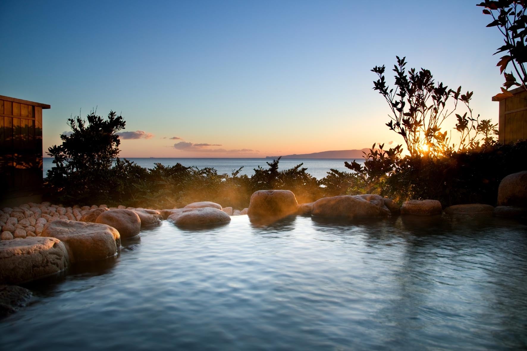豊富な湯量(毎分300ℓ)を誇る2本の自家源泉かけ流しの湯は、温泉大浴場や露天風呂、ジェットバスと岩造り計4ヶ所の貸切風呂(2022年5月リニューアル)などでご堪能いただけます。また北川温泉名物、海抜0メートルで大自然と一体となったような、波打ち際の公共露天「黒根岩風呂」も当館すぐ前。宿泊者は入浴無料です。泉質:ナトリウム・カルシウム-塩化物泉