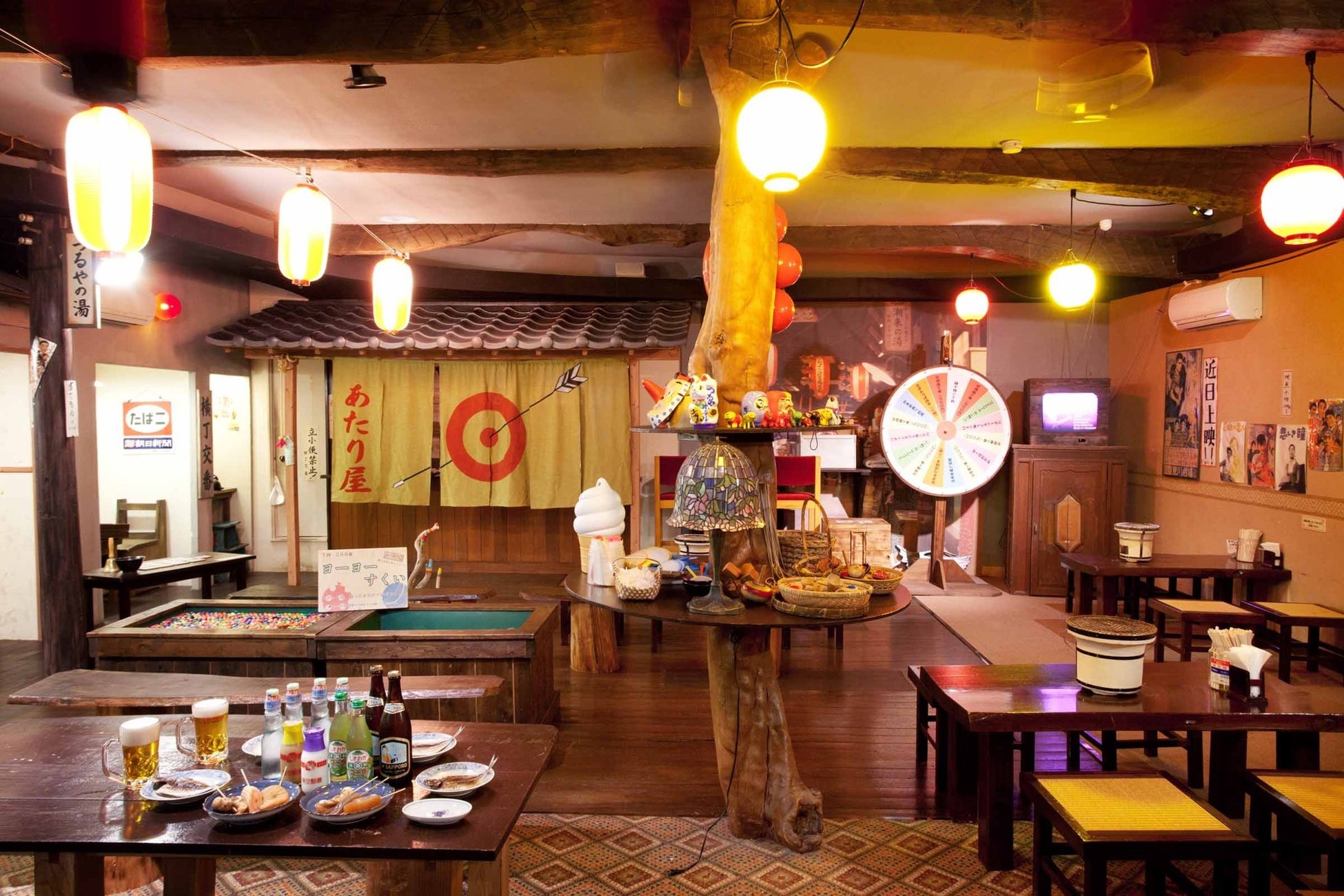 昭和レトロな横丁で、射的やスマートボール、ヨーヨー釣りなどの縁日遊び、伊豆焼酎やラムネなど、昭和の世界が気軽に楽しめます。夕方の湯上りのビール1杯(16:00~17:20)、つるや自家製・自慢の甘酒(16:00~21:00)無料サービスも好評です。