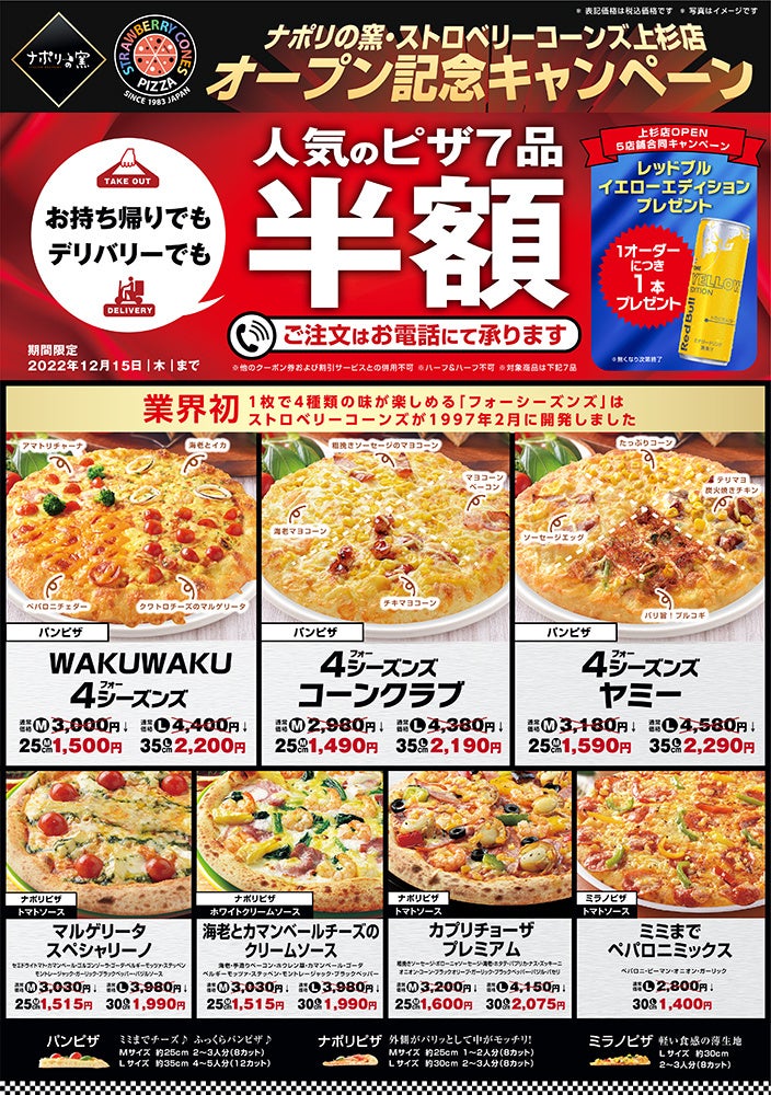 株式会社ストロベリーコーンズ(本社:仙台市青葉区、代表取締役:宮下雅光)が運営する宅配ピザブランド「ナポリの窯」「ストロベリーコーンズ」は、9/17に「上杉店」をオープン致します。