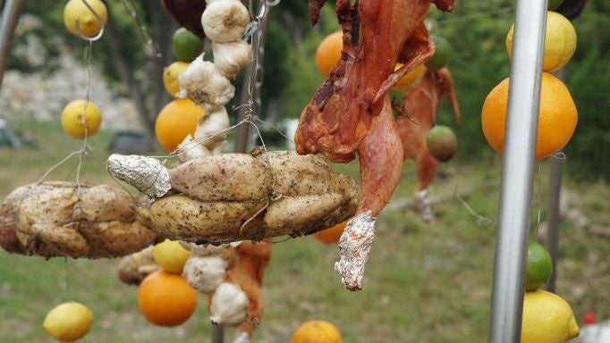 高さが2メートルを超え、巨大な鳥かごのような外観は圧巻そのもの。塊(かたまり)肉やチョリソー(スペイン語でソーセージ)、野菜、果物など様々な食材を吊るして焼く光景は、アート作品のようで“インスタ映え”にも最高です。