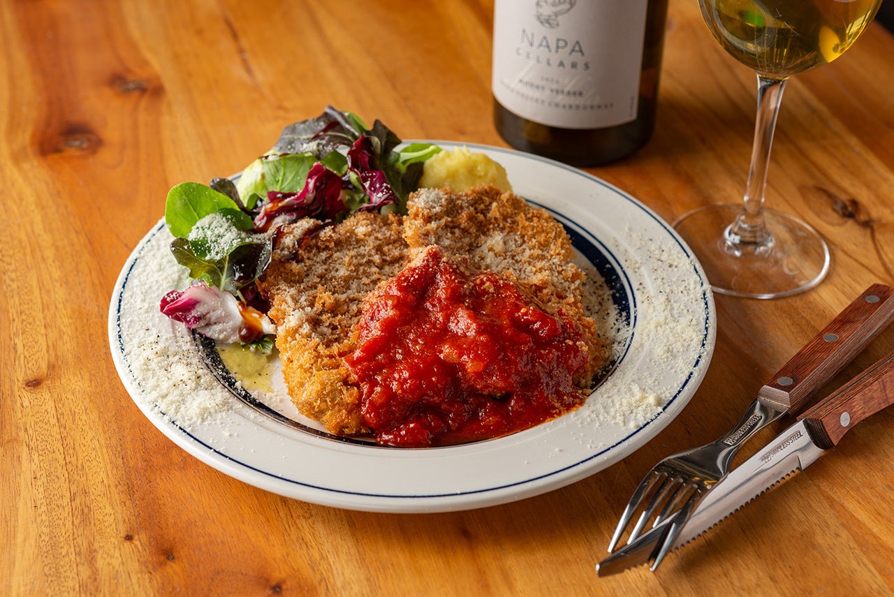 ステーキで使用する柔らかな牛サーロインに、パルミジャーノチーズをきかせ香ばしく揚げた特製のカツレツ。