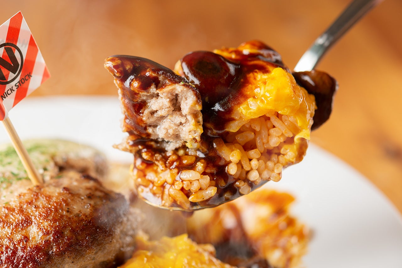 ふわとろに仕上げたオムレツでくるんだ特製ケチャップのオムライスに、ニックストック看板メニューの熟成ハンバーグを贅沢に丸々トッピング!自家製デミグラスソースととろとろチーズをたっぷりかけて、濃厚かつボリューミーな味わいに仕上げた、食欲の秋にぴったりな贅沢オムライスです!