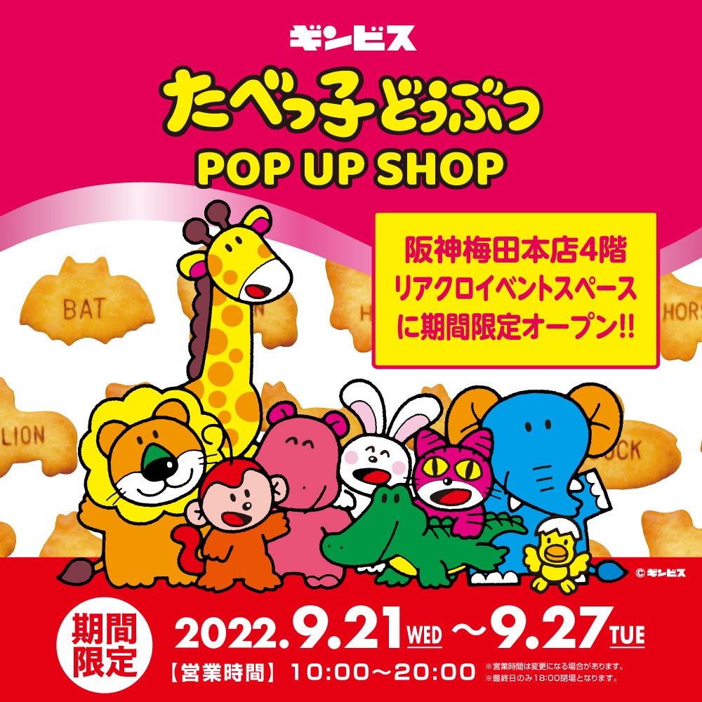 オリジナル商品の企画・制作・販売を軸に、企業・組織のトータルブランディングを手掛ける株式会社ヘソプロダクション(本社:大阪市福島区・代表取締役:稲本ミノル)は、2022年9月21日(水)から9月27日(火)までの間、阪神梅田本店4階 リアクロイベントスペースにて、ギンビスの『たべっ子どうぶつ』をモチーフにしたグッズをたくさん集めた期間限定ショップ『たべっ子どうぶつ POP UP SHOP』を開催いたします。