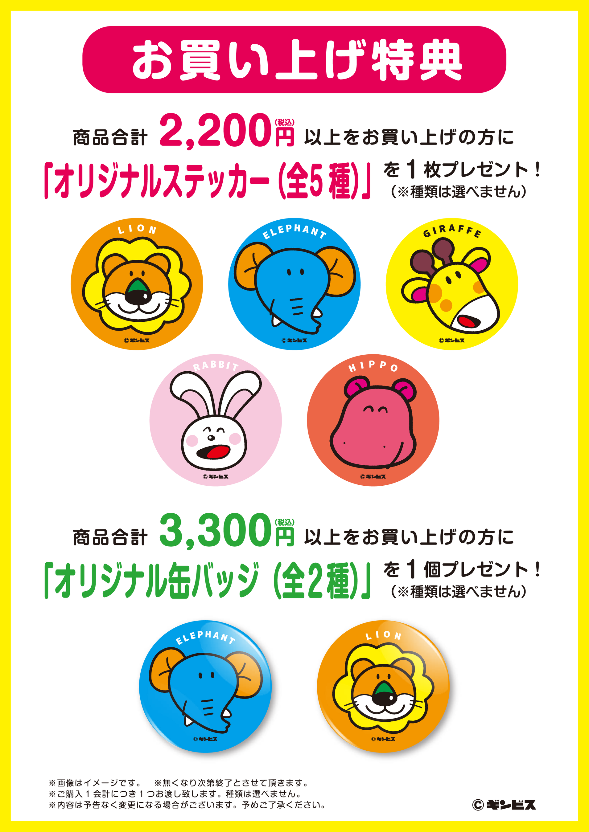 会期中、会場にて「たべっ子どうぶつ」関連商品を1会計2,200円(税込)以上お買い上げのお客様に「オリジナルステッカー(全5種)」を1枚プレゼント!また、1会計3,300円(税込)以上お買い上げのお客様には「オリジナル缶バッジ(全2種)」を1個プレゼントいたします!