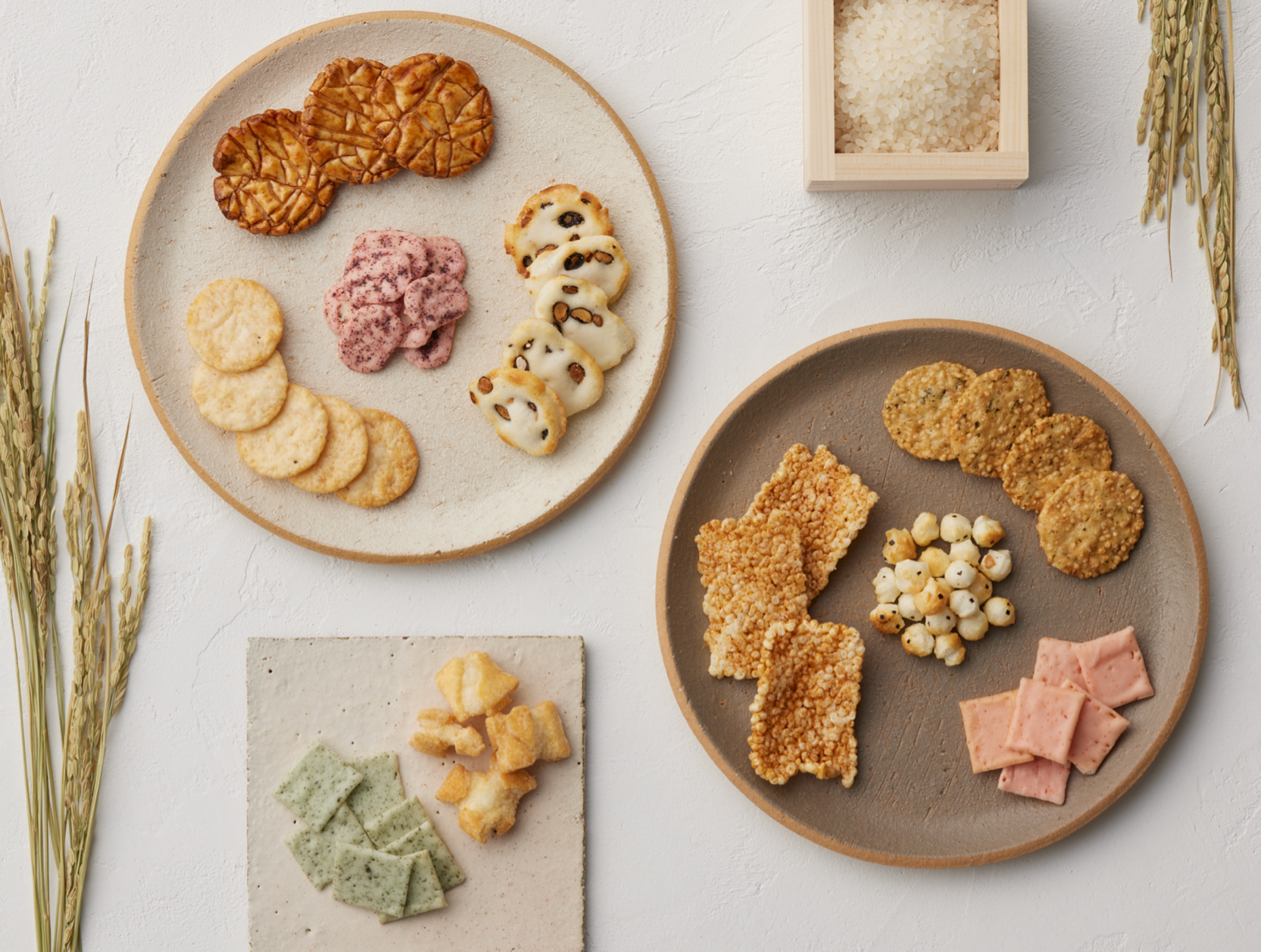 バリエーションが楽しめるよう、せんべいや揚げせんのほか、あられやおかきなどもご用意しました。それぞれに合うよう、小粒タイプやひとくちサイズ、さくっとした歯ごたえやつぶつぶ食感などにしたことで、気分や好みで選べる品揃えになっています。