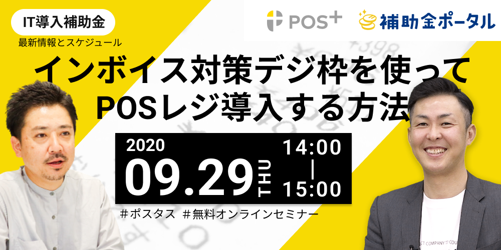 株式会社補助金ポータル(本社:東京都渋谷区、代表取締役:福井彰次 以下、補助金ポータル)は、クラウド型モバイルPOSレジの「POS+(ポスタス)」を提供するポスタス株式会社(本社:東京都中央区、代表取締役社長:本田 興一 以下、POS+(ポスタス))と、2022年9月29日(木)店舗経営者の方向けに「IT導⼊補助⾦ 最新情報とスケジュール、インボイス対策デジ枠を使ってPOSレジ導入する方法」というテーマで無料オンラインセミナーを開催いたします。