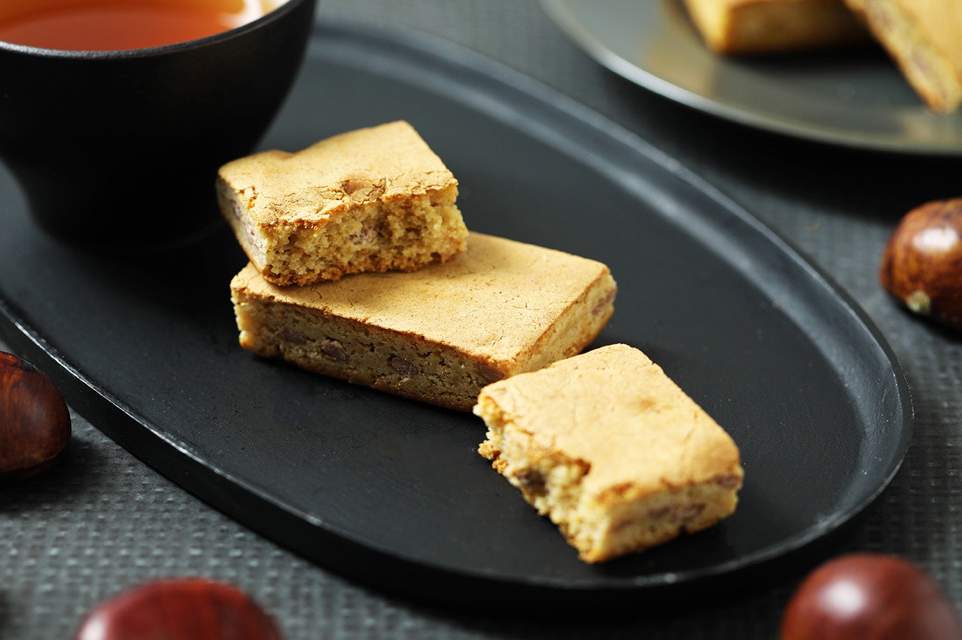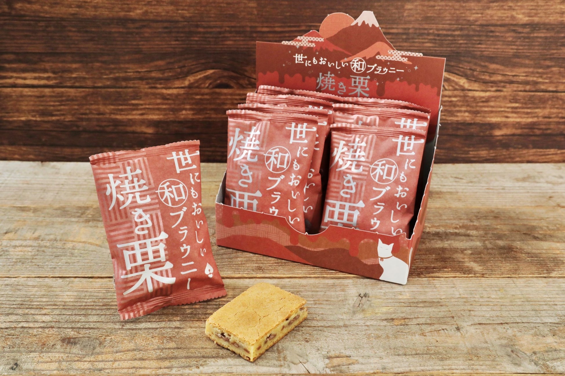 チョコチップのザクっとした食感と、口いっぱいに広がる栗の風味はまるで「焼き栗」を連想させる味わいに仕上げています。緑茶などと合わせて秋のティータイムをお楽しみいただきたい、期間限定の和ブラウニーです。
