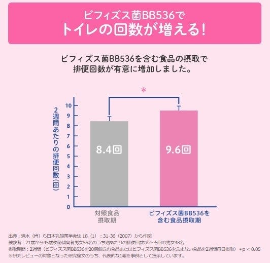 対照食品の摂取期間と比較して、ビフィズス菌BB536を含む試験食品の摂取により、2週間の排便回数が有意に増加した。