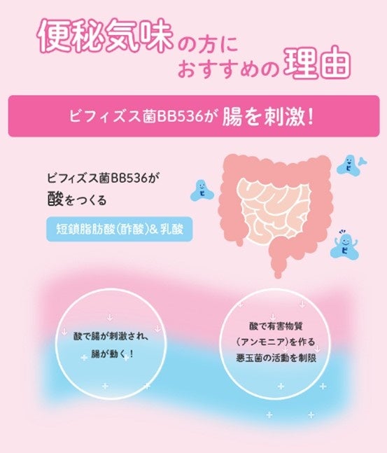 「ビフィズス菌BB536」は、腸内細菌の活動によって生成される代謝産物量に影響を与えることで、腸内環境を調節します。