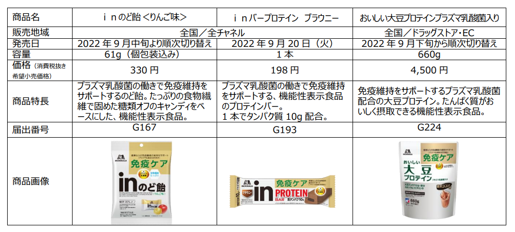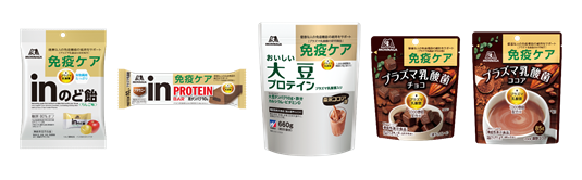 ▲左から、「inのど飴<りんご味>」「inバープロテイン ブラウニー」「おいしい大豆プロテインプラズマ乳酸菌入り」「免疫ケア プラズマ乳酸菌チョコレート」「免疫ケア プラズマ乳酸菌ココア」