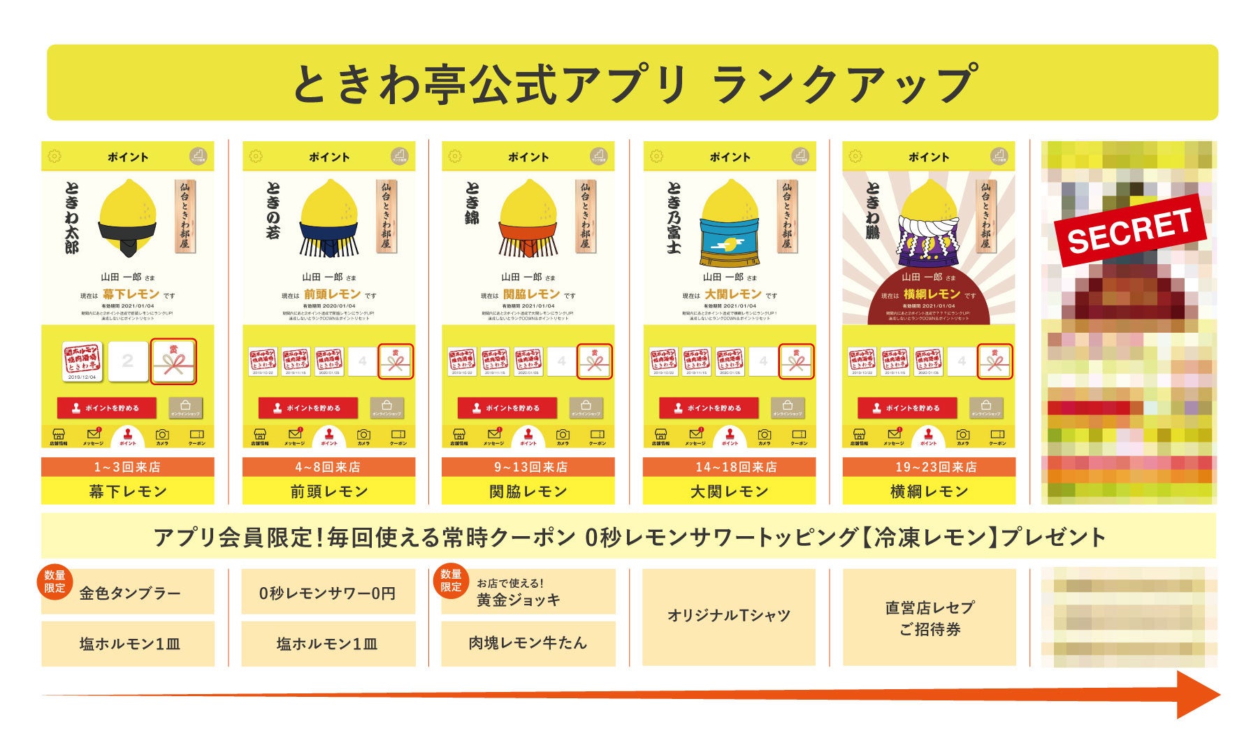 『ときわ亭』公式アプリは現在15万人以上の方にダウンロード・ご利用いただいています。アプリ会員は[0秒レモンサワートッピング 冷凍レモン]がいつでも無料。来店ごとにポイントが貯まり、ポイント数に応じて「前頭レモン」「関脇レモン」といった具合にランクアップ。既に「横綱レモン」まで昇進した強者もいらっしゃいます。また、ランクアップするごとにお得なクーポンやオリジナルグッズがもらえます。その他、誕生日・記念日のプレゼントや、アプリ会員限定のキャンペーンやイベントも見逃せません。アプリ会員になれば、行けば行くほど『ときわ亭』が楽しくなります。ご来店前にぜひダウンロード・登録がおすすめ!!
