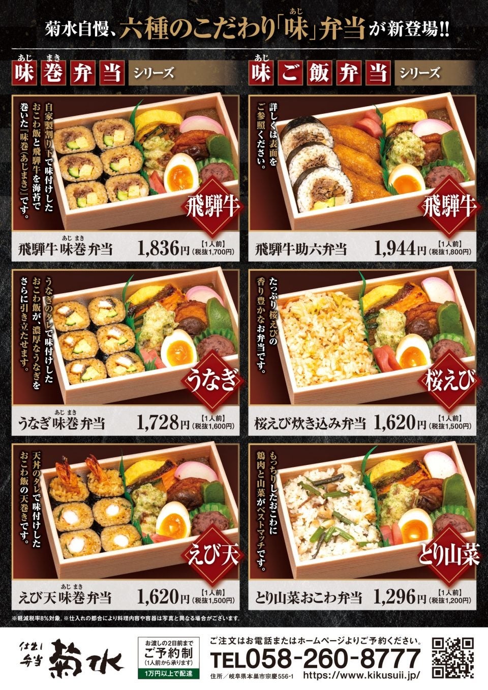 岐阜県にある株式会社偕拓堂サービスが運営する「仕出しお弁当 菊水」は、飛騨牛助六寿司や桜えび炊き込みご飯などの「味ご飯弁当」シリーズ、えび天やうなぎなど濃厚な旨味の食材を味付けおこわ飯と海苔で巻いた「味巻(あじまき)弁当」シリーズ、計6種類を「味」弁当として新発売します。