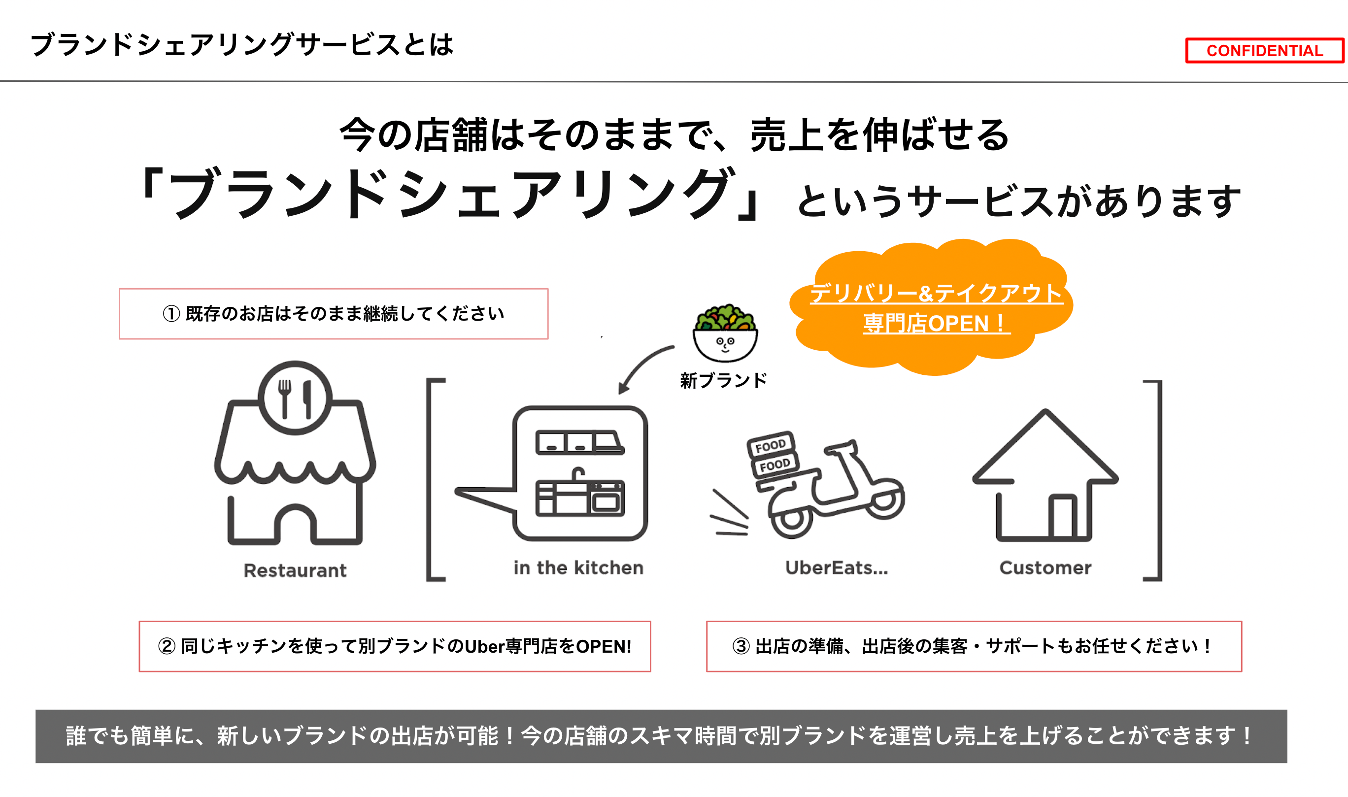 今の店舗はそのまま運営をしながら、Uber Eatsや出前館などのデリバリーサービスを活用し、新たなブランドを運営することで、売上を最大化させていく飲食店の新しいビジネスモデルです。