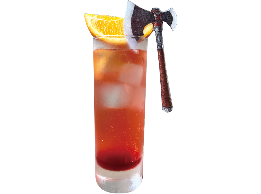 アルコール【有・無】選べます。 ザコキャラが自分の持っていた武器(斧)で逆にやられてしまい、流血した感じを再現しました。味は全然グロくありません。 むしろフルーティーで飲みやすく、ジュースみたいで何杯でも飲めちゃう、酒飲みにはまさにザコ酒です。カットオレンジでモヒカン仕立てに。