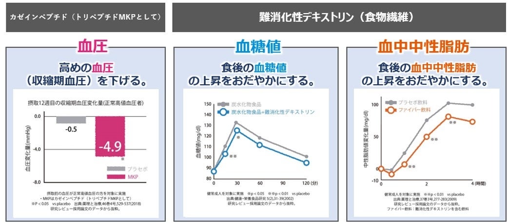 新商品「トリプルサプリ やさしいミルク味」に含まれる、カゼインペプチド(トリペプチドMKP※4として)には、高めの『血圧(収縮期血圧)』を下げる機能、「難消化性デキストリン(食物繊維)」には、食後の『血糖値』や『中性脂肪』の上昇をおだやかにする機能が報告されています。