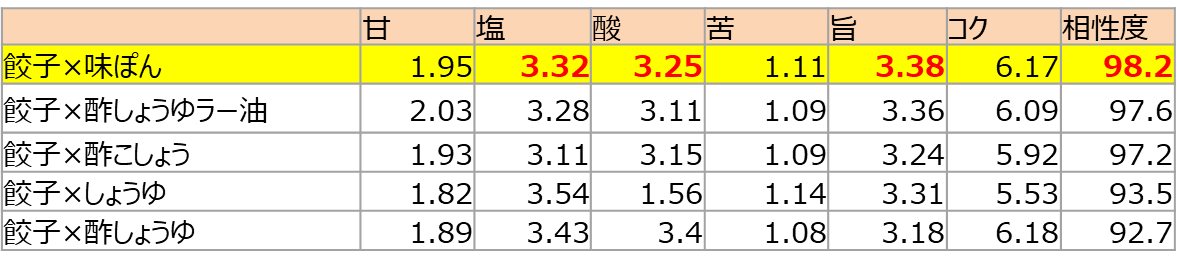 今回の”餃子×味ぽん”の結果は、塩味、酸味、旨味の強さが3~3.5の間をキープしており、まさしくおいしさの黄金比を満たした「絶品の味」と言えるのではないでしょうか。