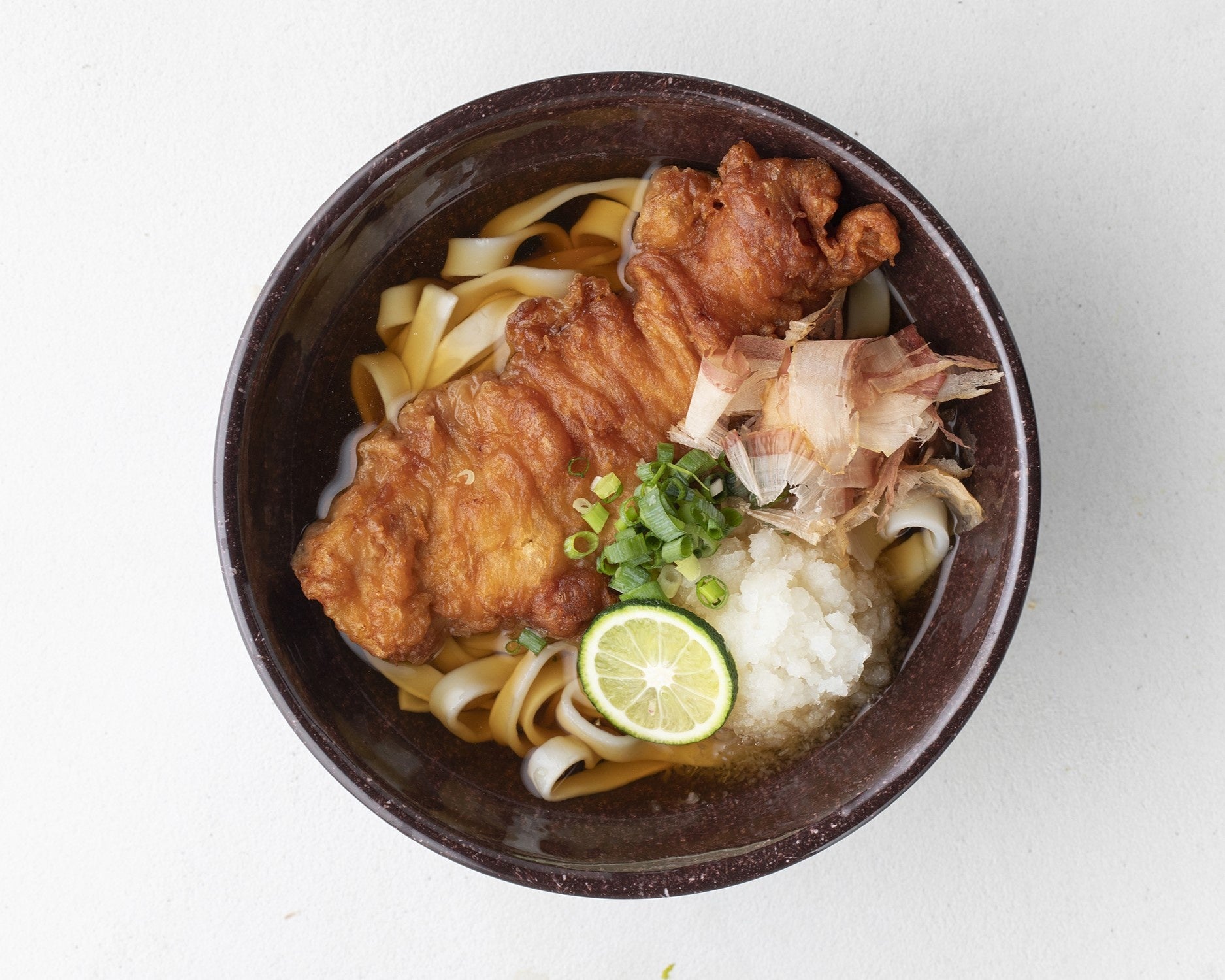 愛知県産小麦「きぬあかり」を使ったもっちりしたきしめんと、東海地方ならではの「さば節」と「むろあじ節」を使った、コクのあるだし汁を使用。名古屋名物きしめんを、より名古屋らしく仕上げました。