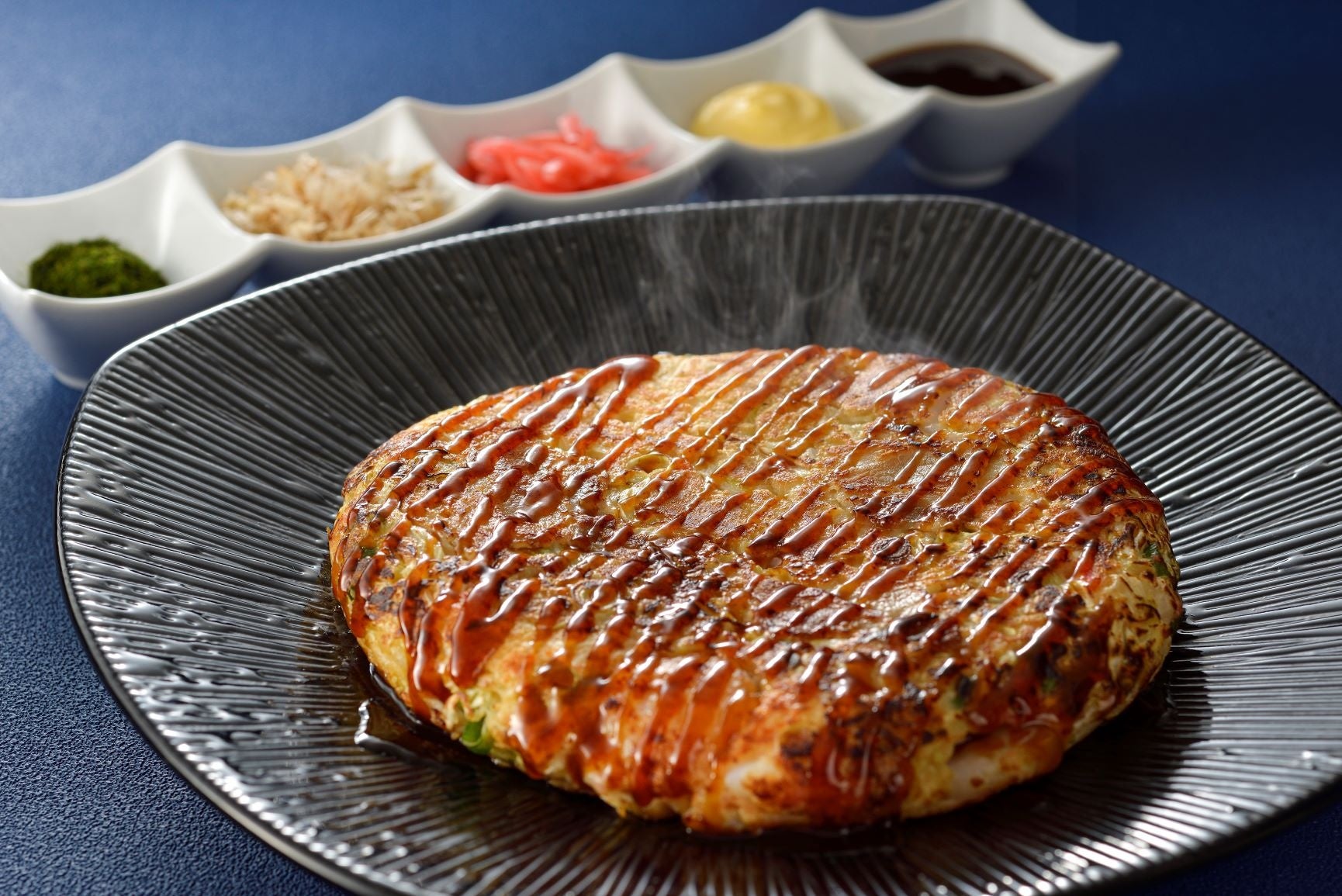食感のお好み焼き。別添えでご用意するマヨネーズや紅ショウガなど