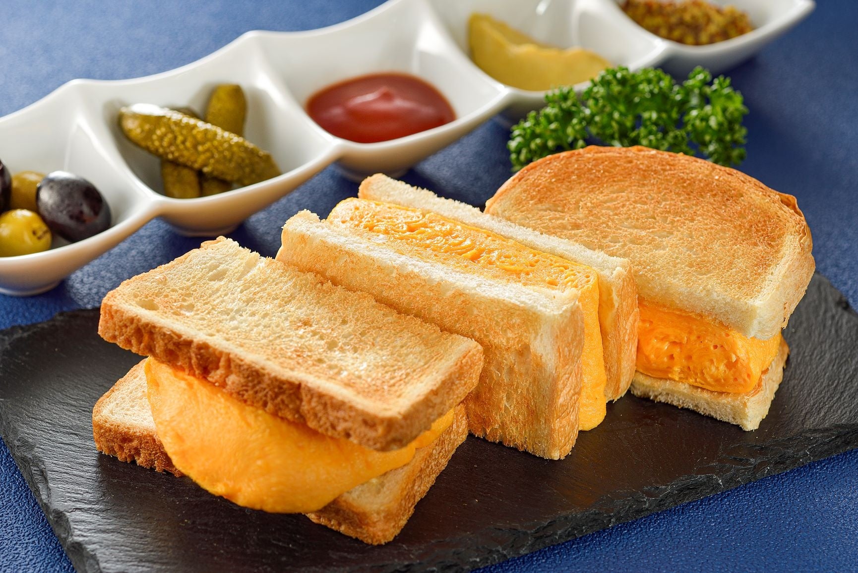 こんがり焼いたパンに、分厚いふわふわオムレツをはさんだ、食べ応えのあるサンドイッチ。シンプルにマヨネーズだけでも、別添えのピクルスやマスタードなどで、お好みで味を変えていただけます。