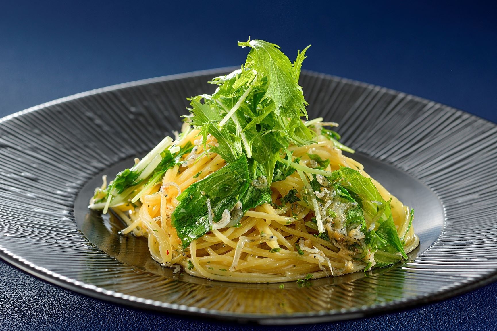 ガーリックの効いた香ばしいオイルパスタに、旨みがぎゅっと詰まったチリメンジャコ、さっと火を通したシャキシャキの水菜を合わせた和風のペペロンチーノ。お客様から好評いただいたメニューを元に創作しました。