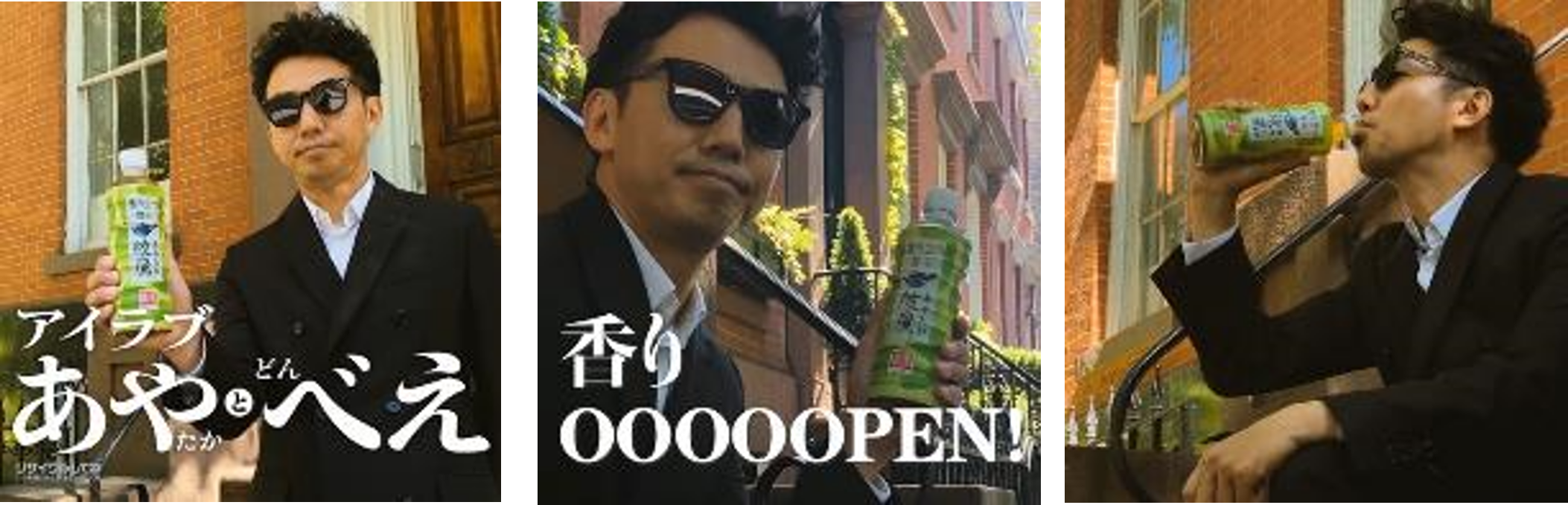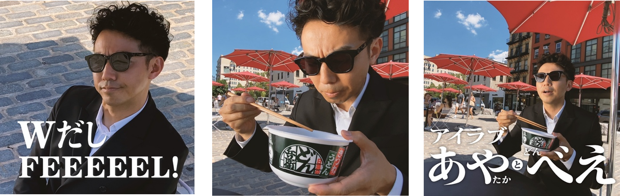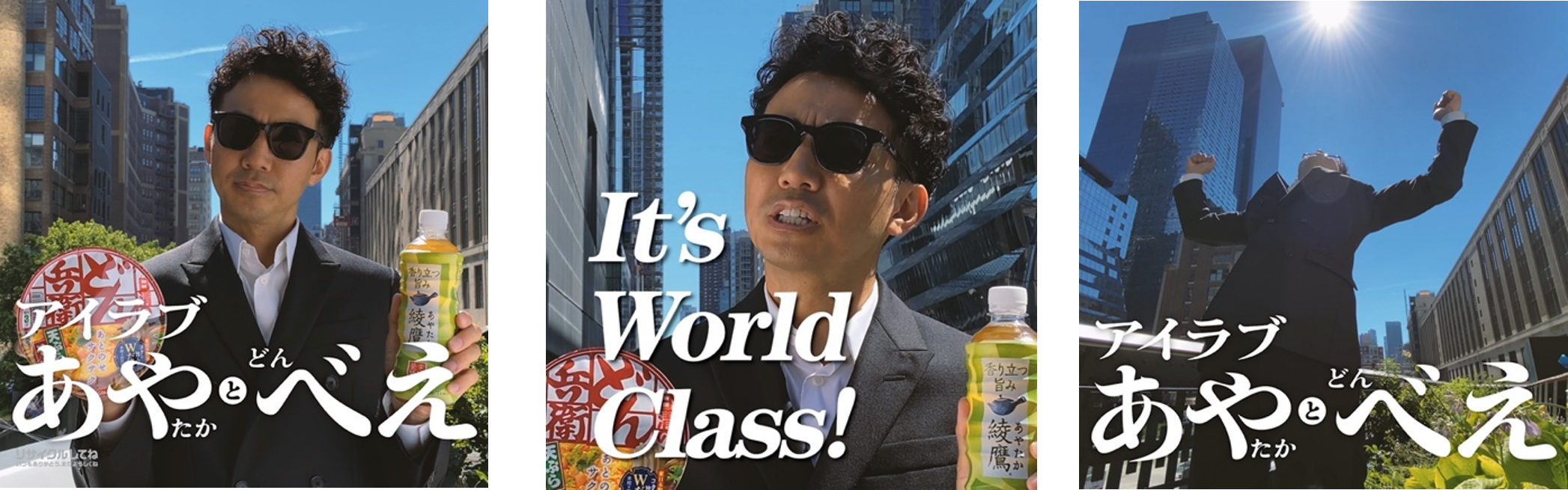 「綾鷹」と「どん兵衛」、「あやたか」と「どんべえ」…「あやべえ」ということで、ワールドアンバサダーは僕しかいないだろうなと思いました。「綾鷹」と「どん兵衛」のワールドクラスのおいしさを、ここニューヨークからお届けします。ぜひとも皆さん、「綾鷹」と「どん兵衛」、そして「アイラブあやべえ!」をよろしくお願いします。