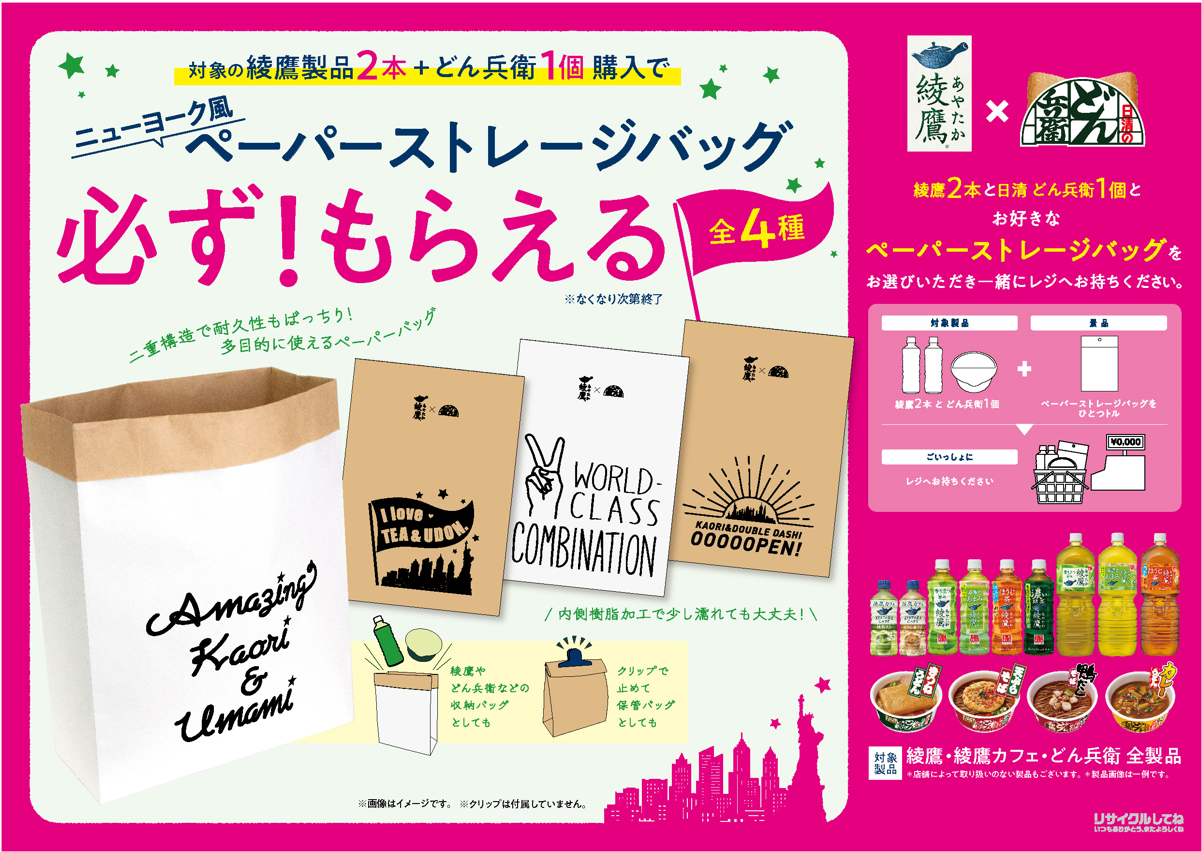 対象の「綾鷹」製品2本と「日清のどん兵衛」1個を購入すると、お好きな「ニューヨーク風ペーパーストレージバッグ」(全4種)を1つもらえます。