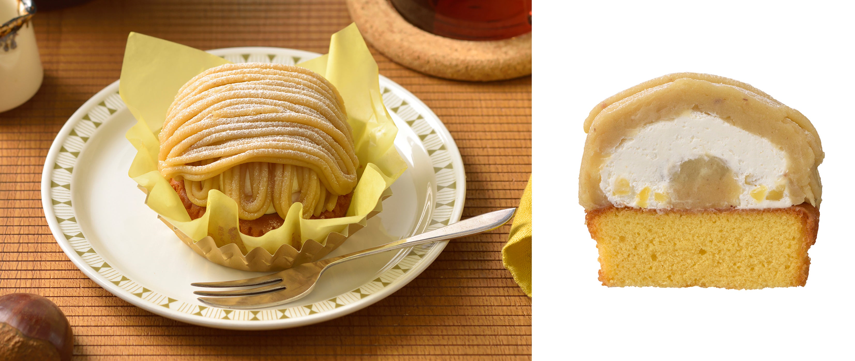 和栗のつぶつぶ食感が楽しめる“和栗ダイス入りクリーム”と、ふわふわスポンジにサンドした和栗の濃厚な味わいが広がる“和栗ペーストクリーム”、上面にたっぷり絞った淡く繊細な味わいの“和栗クリーム”。3種の和栗クリームが互いを引き立て合い、香ばしい和栗のつぶつぶ食感がアクセントとなって最後のひとくちまで和栗のおいしさをご堪能いただけます。