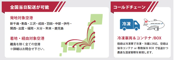 ルーフィと日本航空(JAL)が提供している、陸路と空路の配送を一括手配が行えるサービスです。陸路は最適な車両をマッチング手配し、空路も確保可能な便をシステム連携により選択することで、集荷地から納品地までをひとつのサイトでワンストップ注文できるシステムです。マッチング配送システムでは、常温だけではなくクール(冷凍/冷蔵)配送にも対応している国内唯一のサービスとなります。全国当日配送のスピードに加え、冷蔵・冷凍品でも専用機材を使用することで、食品では鮮度を保ち輸送することが可能です。
