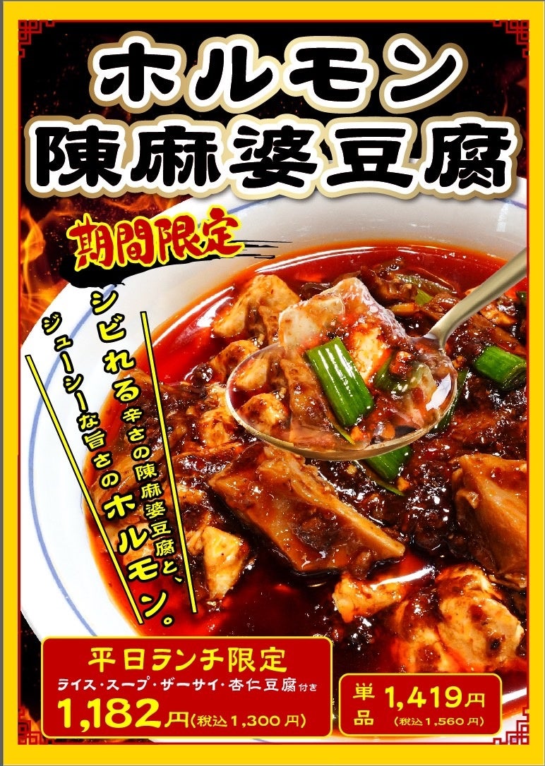 「ホルモン正宗陳麻婆豆腐」は上記価格の+100円となります。