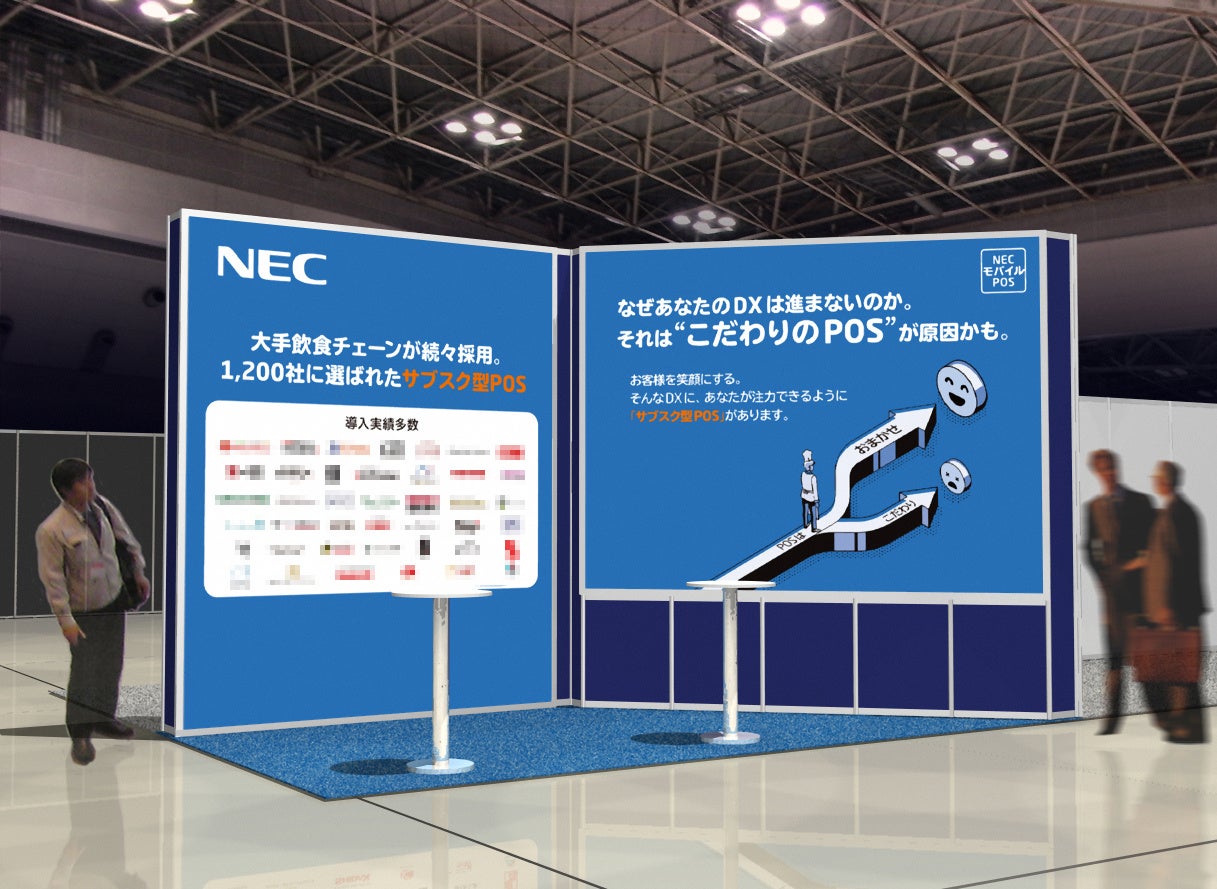 今回のNECの展示ブースのメインメッセージは、「なぜあなたのDXは進まないのか。それは“こだわりのPOS”が原因かも。」です。