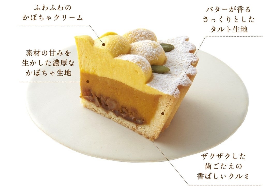 タルト台は、バターが香るさくさくのサブレ生地。素材の甘さを生かした濃厚なかぼちゃ生地を、高さのあるタルト台にたっぷりと流し込んで焼き上げ、ふわふわの軽やかなかぼちゃクリームを花形にデコレーション。