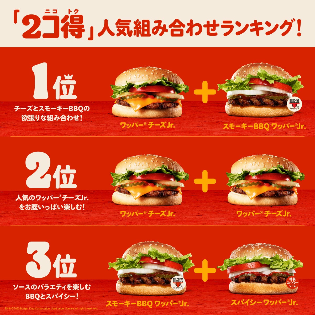 1位は不動の人気を誇る『ワッパー® チーズJr.』と、コクと渋みがクセになる“ブルズアイ™ BBQソース”を使用した新定番『スモーキーBBQワッパー® Jr.』の欲張りな組み合わせ。