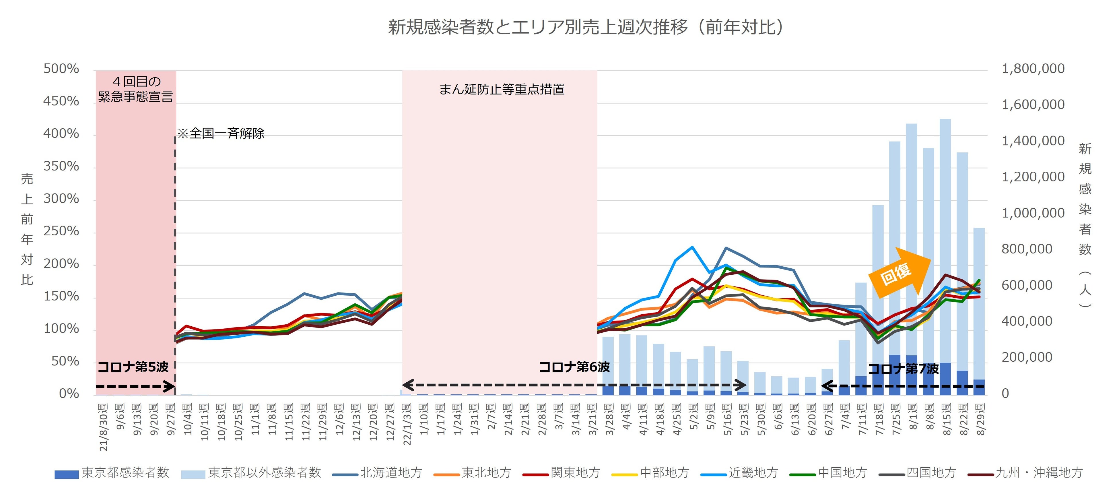 ・7月からの「第7波」到来後も、7月18週を底に前年対比売上は右肩上がりの傾向を示している。
