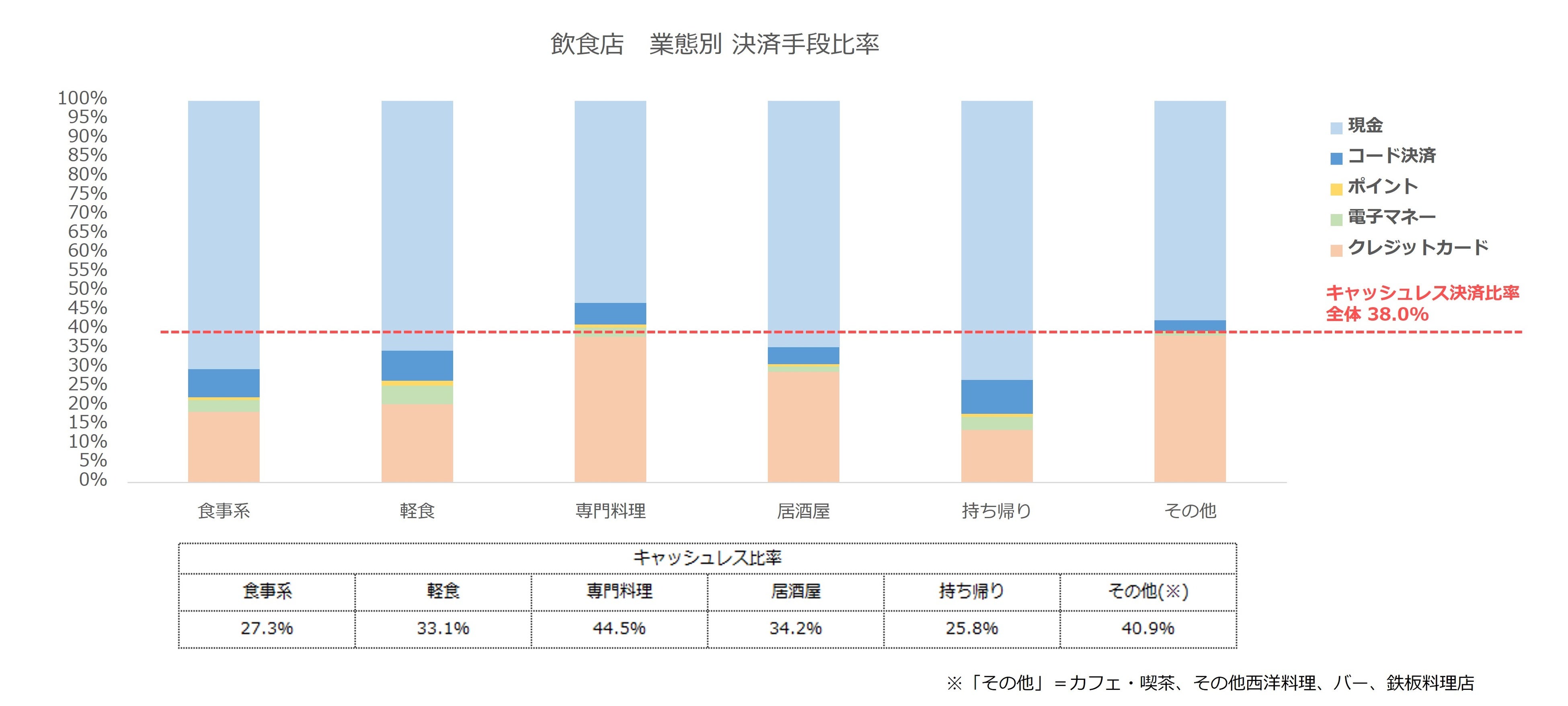 コード決済・電子マネーの使用比率は食事・軽食系・持ち帰り業態で高い。