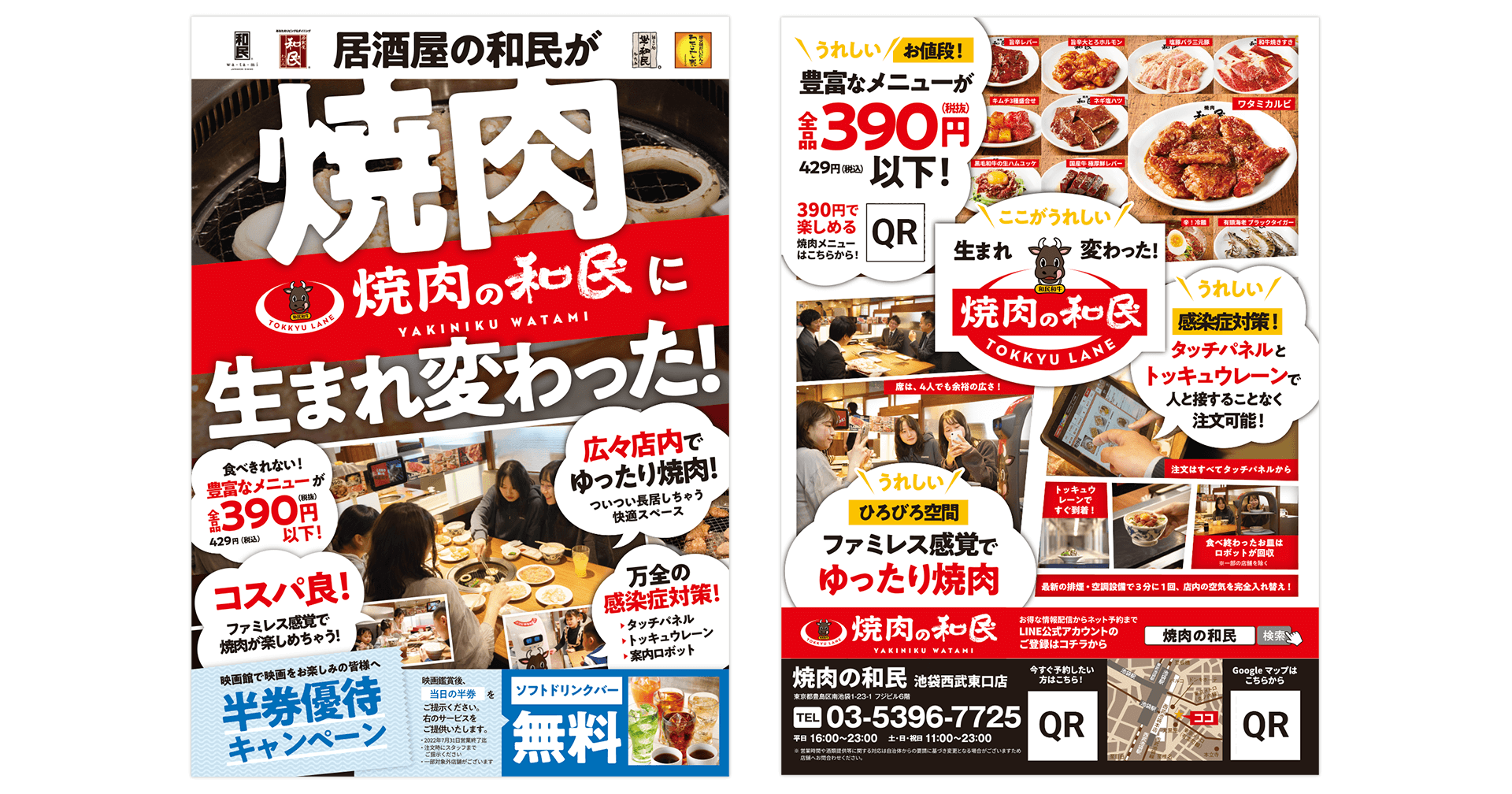 居酒屋の「和民」から「焼肉の和民」への業態変更により、ファミリー層や女性グループ、飲酒をしないグループも新たな顧客層として設定。来店してもらうためのプロモーション活動として、下記2パターンでチラシを配布した場合のQRコード読取率に差があるかを検証しました。