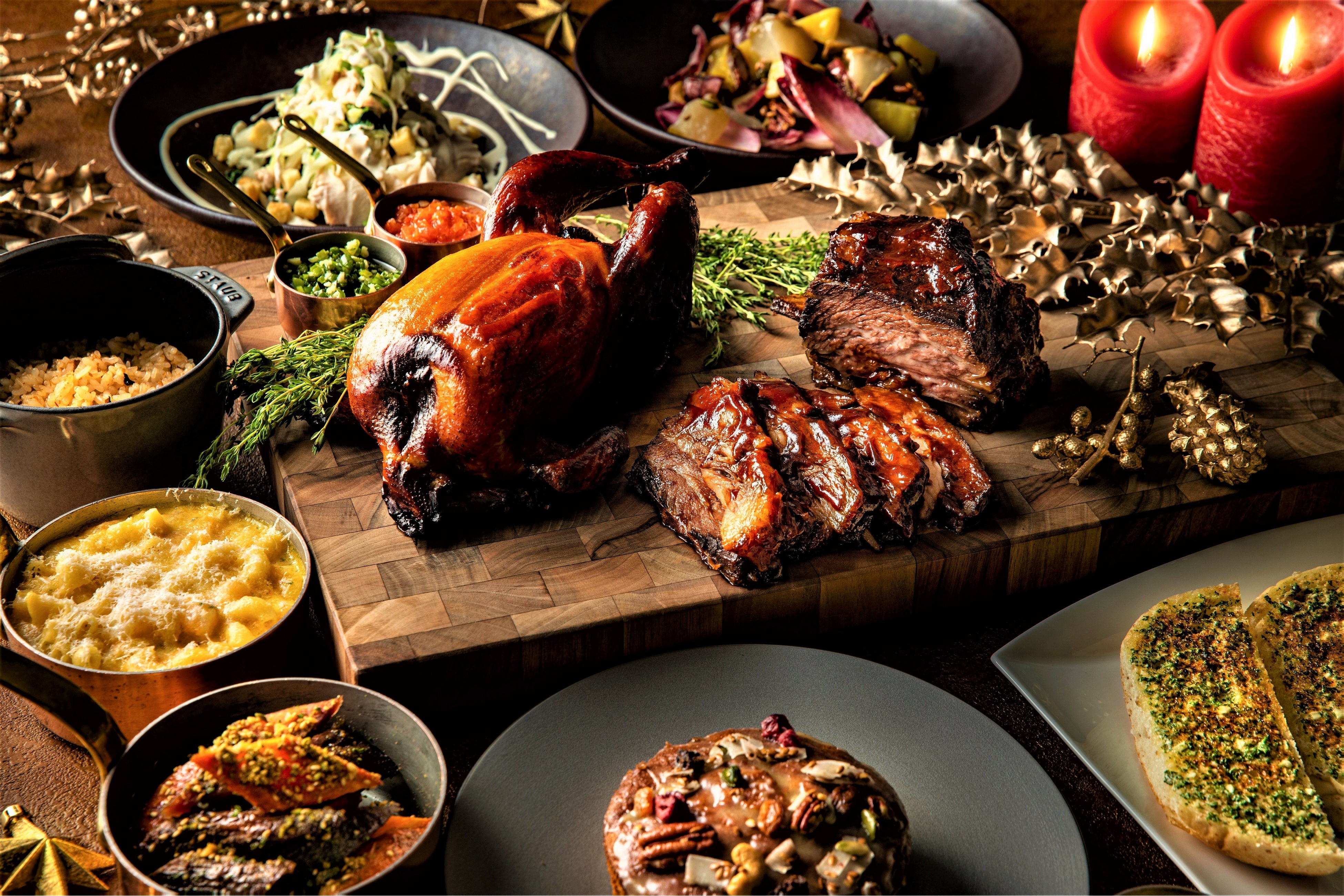 自家製ビーフリブ・サルサロハ / ホールチキンのロースト・ジンジャー&グリーンシャロットレリッシュ / クラブ&プラウン マッケンチーズ / グレイズドキャロット・ピスタチオデュカ / XO醬バターライス / ガーリックトースト / クリスマスプディング・酒粕アングレーズ