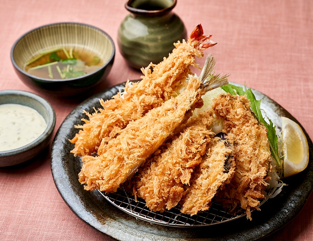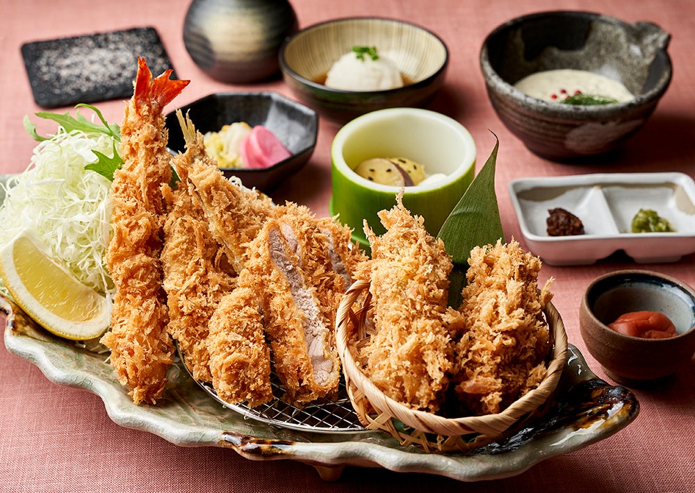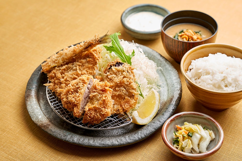 大粒で肉厚の広島産牡蠣フライ、コクと甘さのある肉質が特長の広島の銘柄豚“瀬戸内六穀豚”を使用した六穀豚ロースかつ、脂がのってきめ細かな身質の長崎対馬沖の真アジのフライ、プリプリの海老フライを贅沢に盛り合わせました。