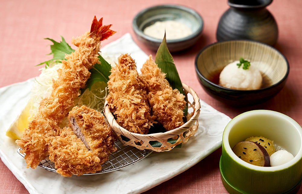 脂がのってきめ細かな身質の長崎対馬沖の真アジのフライ、うま味をとじ込めた本格的な味わいのヒレかつ、野菜フライを盛り合わせました。