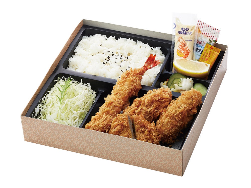 広島産牡蠣フライ(2個)・ヒレかつ(40g)・海老フライ・季節の甘味または茶碗蒸し・ご飯・味噌汁・漬物