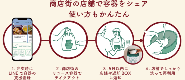・容器の専用の返却BOXは、「キラキラ橘商店街」事務所前や、一部参加店舗の前に設置します。購入した店舗以外でも時間帯を選ばず容器を返却することができます。返却された容器は店舗で再度洗浄します。