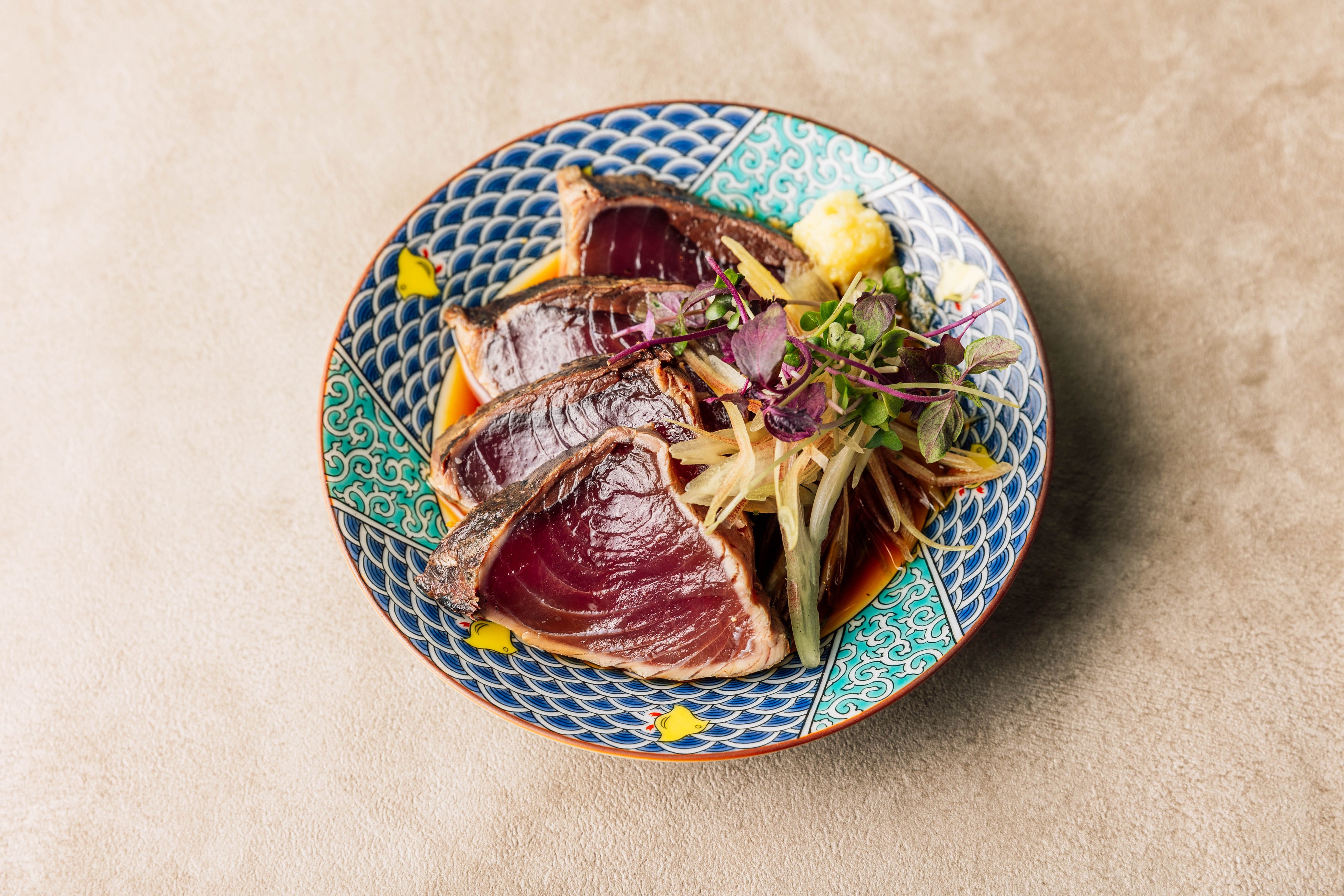 脂ののった戻り鰹を、ポン酢とおろし生姜、薬味でさっぱりと楽しむ、残暑が残り今の時期におすすめの一皿。焼津市特産の鰹は、枯節の工程をさらに繰り返し、3カ月間熟成させて作る旨味と香りが一層楽しめる本枯節のポン酢との相性抜群です。