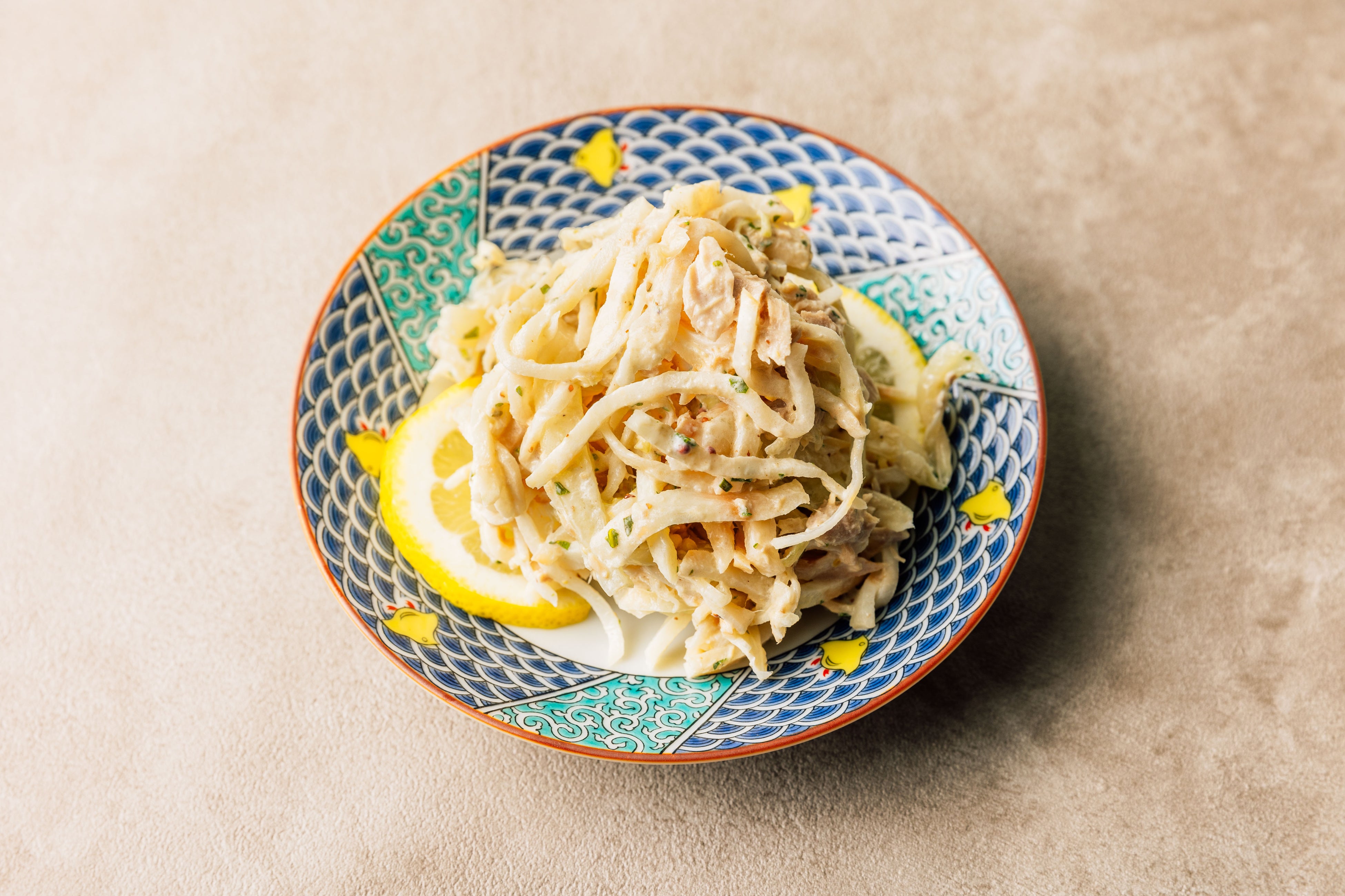 焼津鰹を釜揚げした “なまり節” は、脂ののった鰹本来の自然な味わいが魅力。そんな「なまり節」を根セロリ、キャベツ、そしてヨーグルトやマヨネーズを加えたレムラードソースとあえ、ほんのりスパイスを効かせて仕上げました。